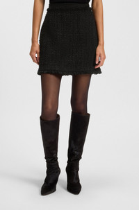 SIZE AND FIT The model wears a size 4 and is 5'9" tall with a, 32" chest, 23" waist and 35" hips. DETAILS Create modern looks with heritage charm in this velvet-tweed BOSS Womenswear mini skirt. Blended with soft cotton and virgin wool. Regular fit Mini skirt Zip closure Short length Fit back length: 43 cm (17 inches) Vokila - 50548094 QUALITY & CARE INSTRUCTIONS Do Not Wash Material: 50% Cotton (19% recycled), 16% Polyamid, 15% Polyester, 13% Polyacrylic, 5% Virgin wool, 1% Other fibres, Lining: 55% Polyester, 45% Viscose Do Not Tumble Dry Reduced Dry Clean Iron Low Heat Do Not Bleach
