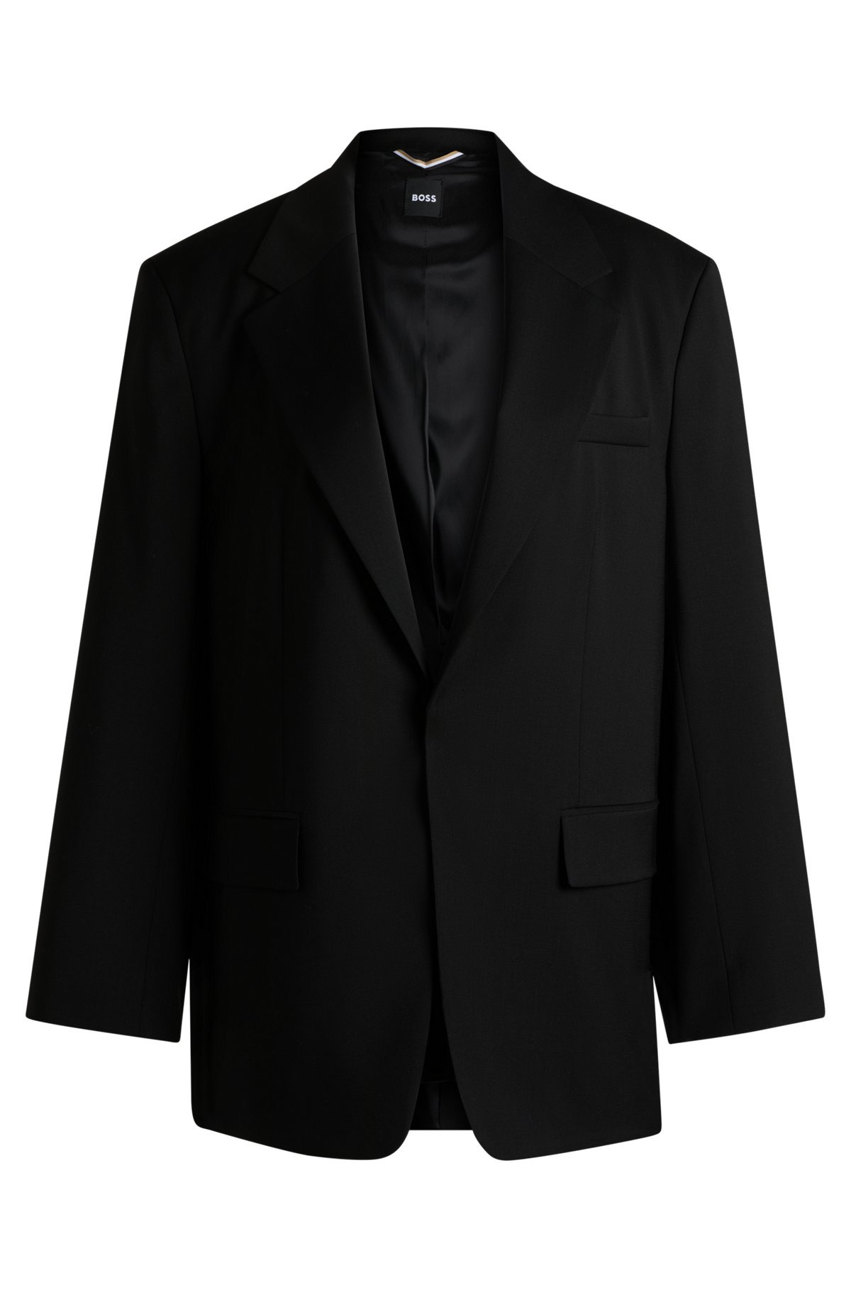 DETAILS Jaleda - 50537387 In a solid weave for adaptable styling, this BOSS Womenswear blazer is a versatile investment. Boxy fit with a clean edge-to-edge front. Oversized fit Notched lapels Fastening top: Open front Welt chest pockets Pockets top: Flap pockets Button cuffs Back vent Fully lined Fit back length: 76 cm (30 inches) QUALITY & CARE INSTRUCTIONS Do Not Tumble Dry Do Not Bleach Quality: 100% Virgin wool, Lining: 64% Viscose, 36% Polyester Do Not Wash Iron Low Heat Reduced Dry Clean