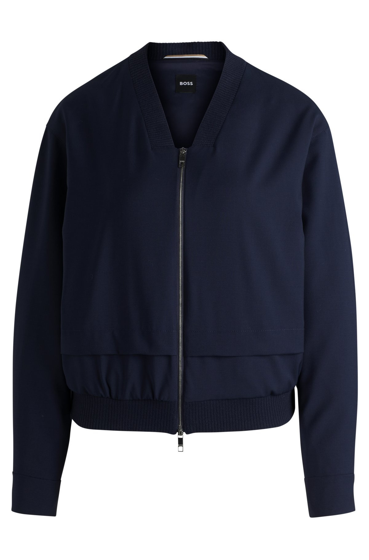 SIZE AND FIT The model wears a size 4 and is 5'9" tall with a, 0" chest, 23" waist and 35" hips. DETAILS Jirian - 50531883 The roomy fit of this BOSS Womenswear jacket allows you to create easy layered looks. Wool, layered effect, versatile two-way zip. Oversized fit Fastening top: Zip closure Pockets top: Side-entry pockets Button cuffs Fully lined Fit back length: 55 cm (22 inches) QUALITY & CARE INSTRUCTIONS Reduced Dry Clean Do Not Bleach Do Not Tumble Dry Quality: 100% Virgin wool, Lining: 64% Viscose, 36% Polyester, Collar: 90% Polyacrylic, 8% Polyamid, 2% Elastane Do Not Wash Iron Low Heat