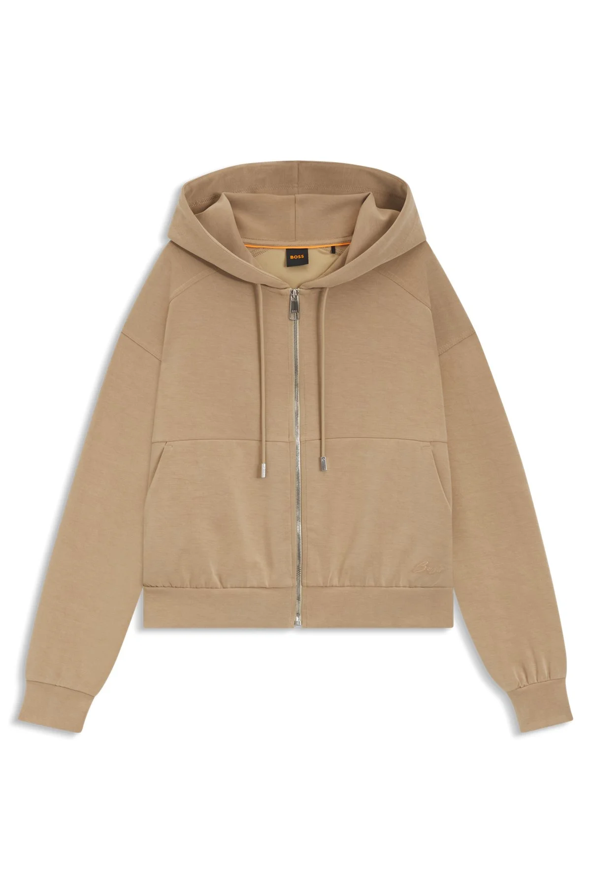 DETAILS With a relaxed fit and roomy sleeve shape, this BOSS Womenswear hoodie layers effortlessly. Soft stretch fabric. Embroidered handwritten logo. Kangaroo pockets. Oversized fit Neckline: Hooded Fastening top: Zip closure Pockets top: Seam pocket Long sleeves Standard length C_Elijak - 50547813 QUALITY & CARE INSTRUCTIONS Do Not Dry Clean Do Not Tumble Dry Material: 52% Modal, 46% Polyester, 2% Elastane, pocketing: 100% Cotton Iron Low Heat Do Not Bleach Machine Wash Cold Gentle