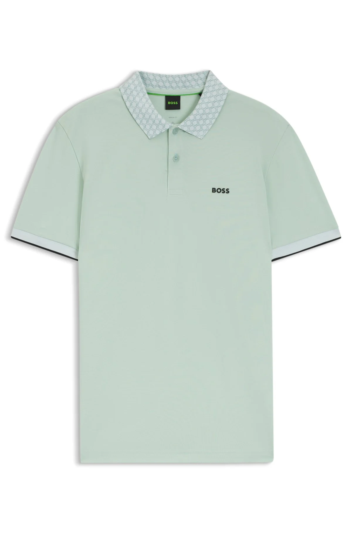 SIZE AND FIT The model wears a size M and is 6'2" tall with a, 38" chest, 29" waist and 38" hips. DETAILS With a hexagonal-printed collar, this regular-fit BOSS Menswear polo shirt is a sporty must. Quick-dry stretch-cotton pique for easy movement. Regular fit Neckline: Flat-knit collar Number of buttons: 2 Short sleeves Flat-knit cuffs Standard length PL_GOC Chip Paddy - 50554583 QUALITY & CARE INSTRUCTIONS Machine Wash Cold Gentle Do Not Bleach Do Not Tumble Dry Do Not Dry Clean Iron Low Heat Material: 92% Cotton, 8% Elastane