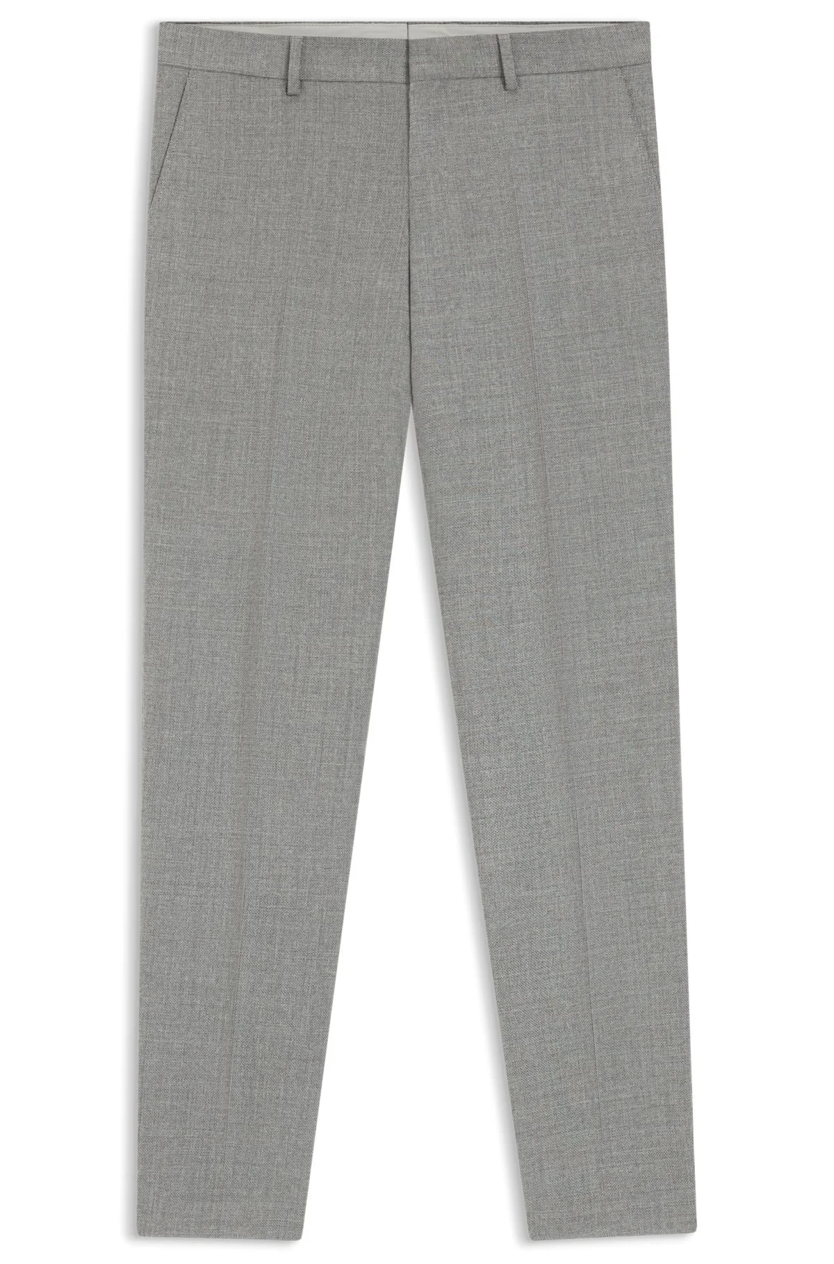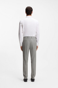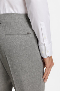SIZE AND FIT The model wears a size 32R and is 6'1" tall with a, 37" chest, 29" waist and 35" hips. DETAILS Designed in virgin wool with added stretch for flexibility, these subtly patterned BOSS Menswear trousers are easy to style. Cut to a slim fit. Slim fit Hook and zip closure Pleat front Pockets bottom front: Side slash pockets Pockets bottom back: Welt pocket Partially lined H-Genius-253 - 50564107 QUALITY & CARE INSTRUCTIONS Do Not Tumble Dry Do Not Wash Do Not Bleach Iron Low Heat Reduced Dry Clean Material: 99% Virgin wool, 1% Elastane, pocketing: 65% Polyester, 35% Cotton, knee lining: 100% Viscose