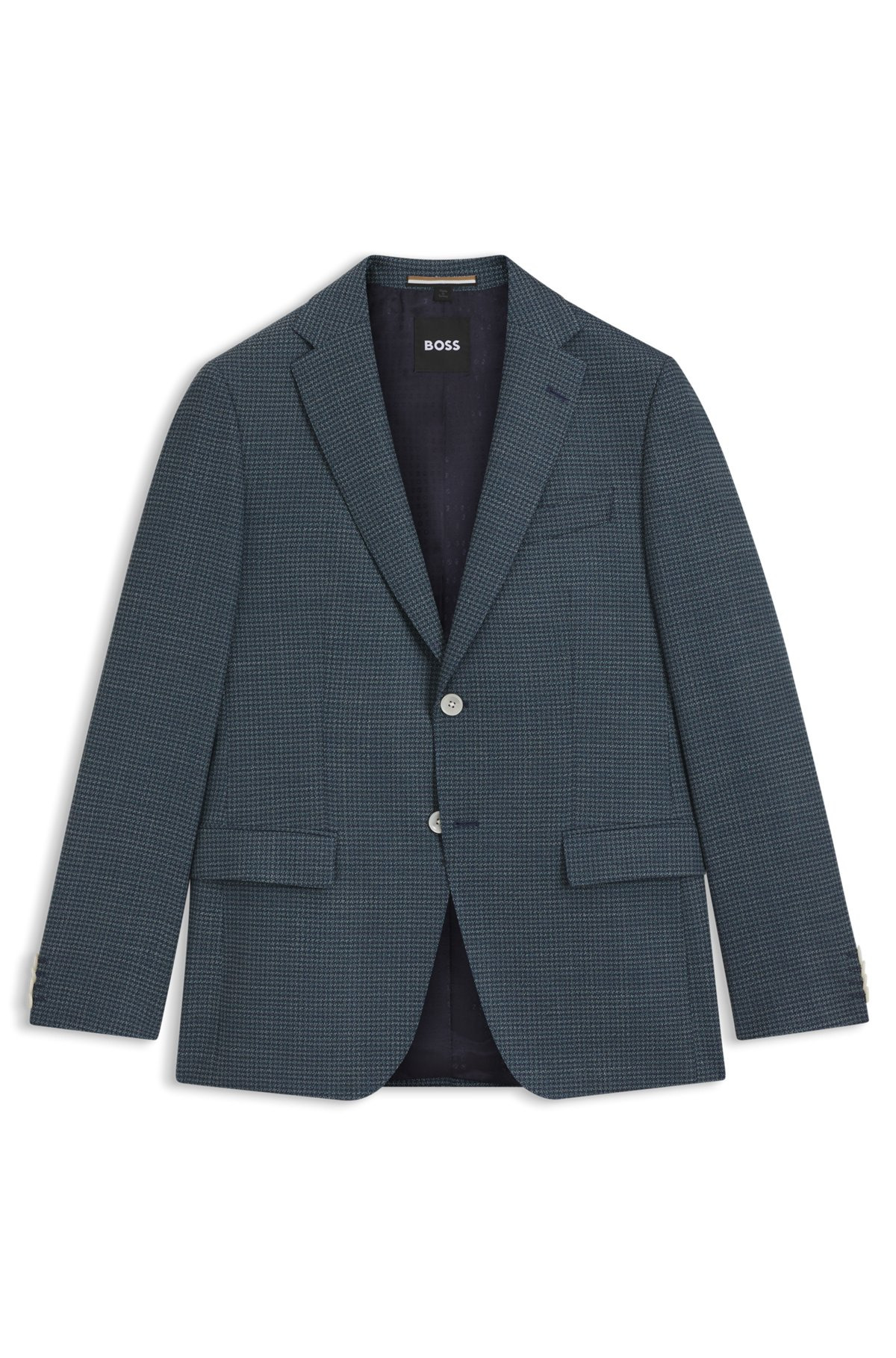 SIZE AND FIT The model wears a size 40R and is 6'1" tall with a, 38" chest, 31" waist and 37" hips. DETAILS H-Hutson-251 - 50553857 With an easy-to-style pattern, this BOSS Menswear suit jacket offers advanced comfort. Crafted in wool with stretch for crease recovery. Slim fit Notched lapels Fastening top: Button closure Number of buttons: 2 Welt chest pockets Pockets top: Flap pockets Kissing buttons on the cuff Side vent Fully lined QUALITY & CARE INSTRUCTIONS Do Not Tumble Dry Quality: 80% Virgin wool, 18% Viscose, 2% Elastane, Lining: 100% Viscose, Sleeve lining: 100% Viscose Reduced Dry Clean Iron Low Heat Do Not Wash Do Not Bleach