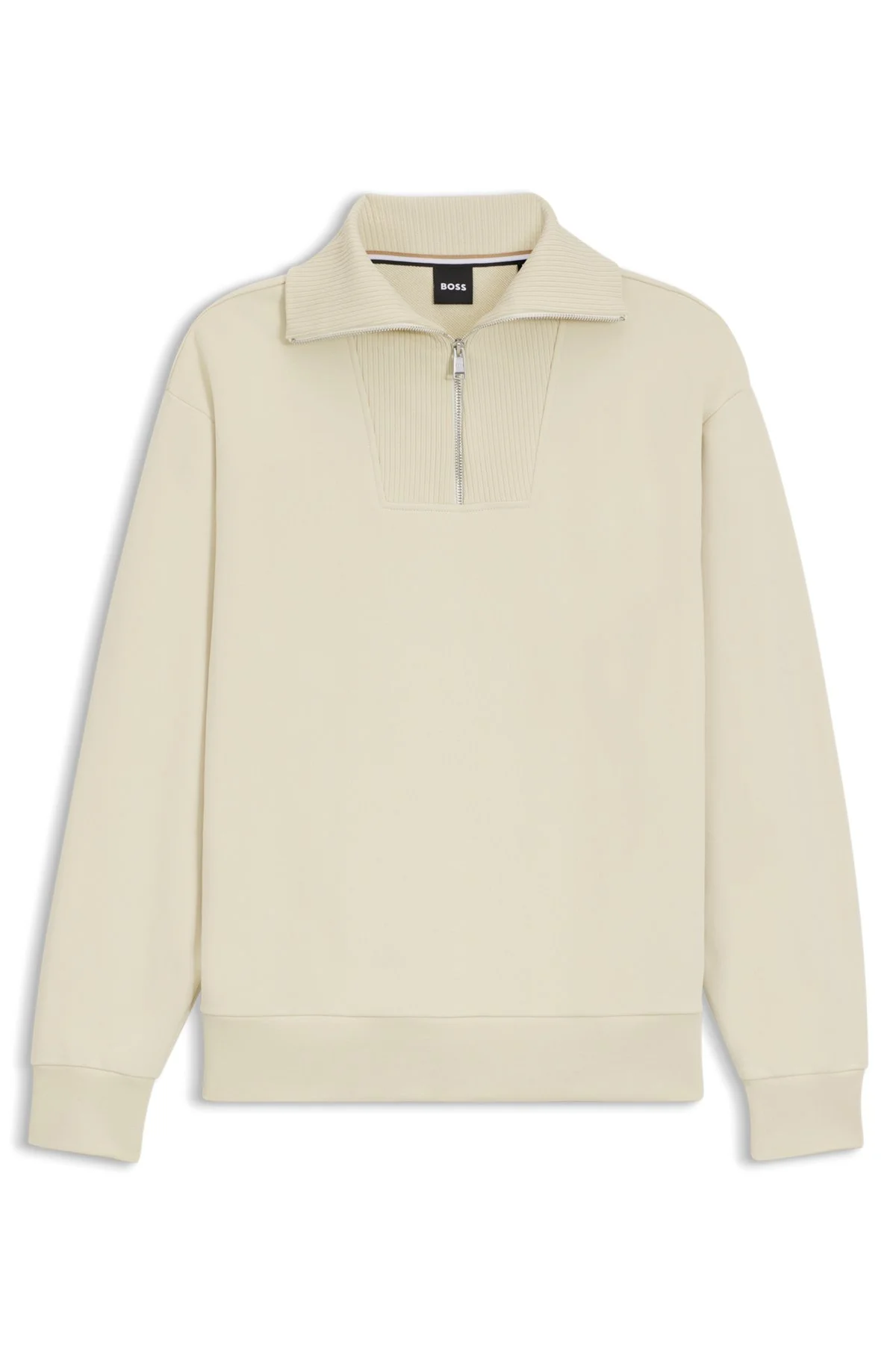 DETAILS Layer up in refined comfort with this BOSS Menswear sweatshirt, crafted in cotton terry that's been peached for extra softness. Ribbed insert. Zip collar. Regular fit Neckline: Zip neck Long sleeves Standard length C-Sidney 31 - 50548947 QUALITY & CARE INSTRUCTIONS Iron Low Heat Do Not Tumble Dry Material: 100% Cotton Do Not Dry Clean Do Not Bleach Cold, gentle machine wash; reduced spin speed.