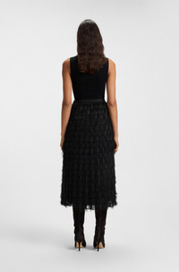 SIZE AND FIT The model wears a size 4 and is 5'10" tall with a, 33" chest, 23" waist and 34" hips. DETAILS Whether paired with a blouse or T-shirt, the feather jacquard of this BOSS Womenswear skirt makes all the right statements. Neat rear zip. Regular fit Regular rise A-line skirt Hook and zip closure Fully lined Standard length VODIA - 50546821 QUALITY & CARE INSTRUCTIONS Quality: 100% Polyester, Lining: 100% Polyester, Waistband: 80% Polyester, 16% Viscose, 4% Elastane Iron Low Heat Do Not Tumble Dry Reduced Dry Clean Do Not Bleach Do Not Wash