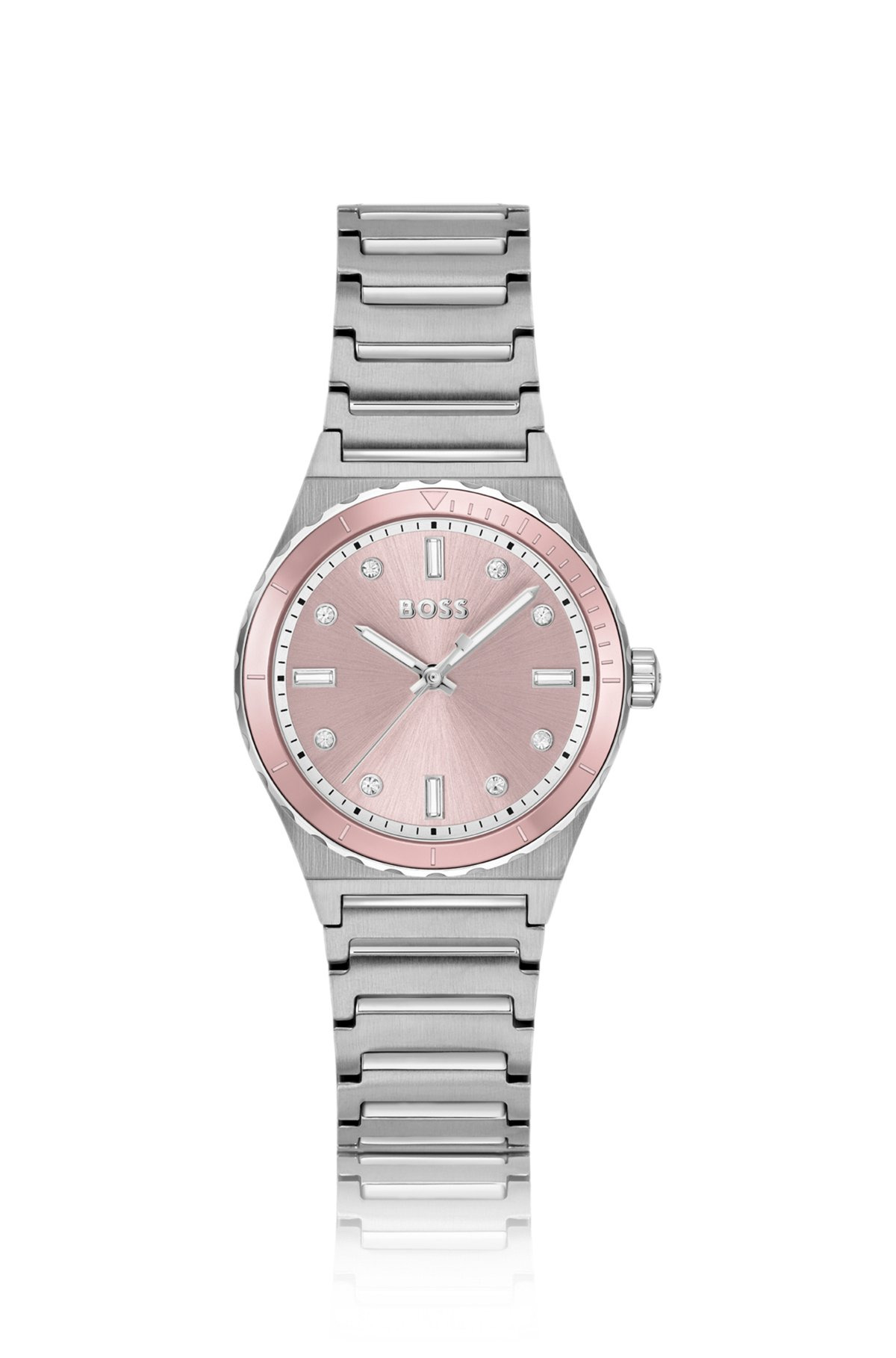 DETAILS CANDOR SPORT - 58244938 With crystal indexes sparkling on a pink dial, this BOSS Womenswear watch is a sophisticated option. Fully integrated link bracelet. Prominent bezel with aluminum insert. Watch mechanism: Three-hand Dial color: pink Strap material: Stainless steel Closure: Push-button deployment Case size: 1.26 in (32 mm) (0 inches) Water Resistance (in ATM): 3 ATM QUALITY & CARE INSTRUCTIONS Quality: 100% Stainless steel