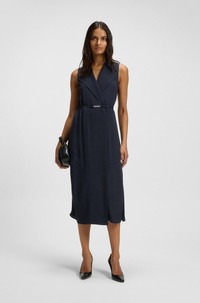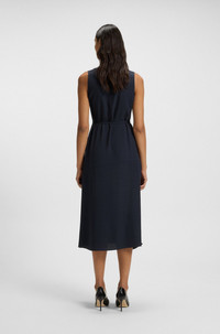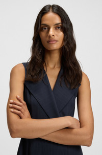 SIZE AND FIT The model wears a size 4 and is 5'8" tall with a, 29" chest, 22" waist and 35" hips. DETAILS Dimosa - 50548494 With its sleeveless styling and pinstripe pattern, this BOSS Womenswear dress is an instant classic. Drapey fabric with a belt detail and buttoned wrap front. Fit back length: 120 cm (47 inches) QUALITY & CARE INSTRUCTIONS Do Not Wash Reduced Dry Clean Do Not Tumble Dry Quality: 100% Viscose Do Not Bleach Iron Low Heat