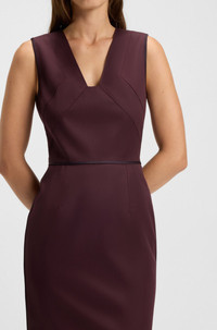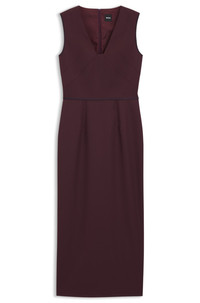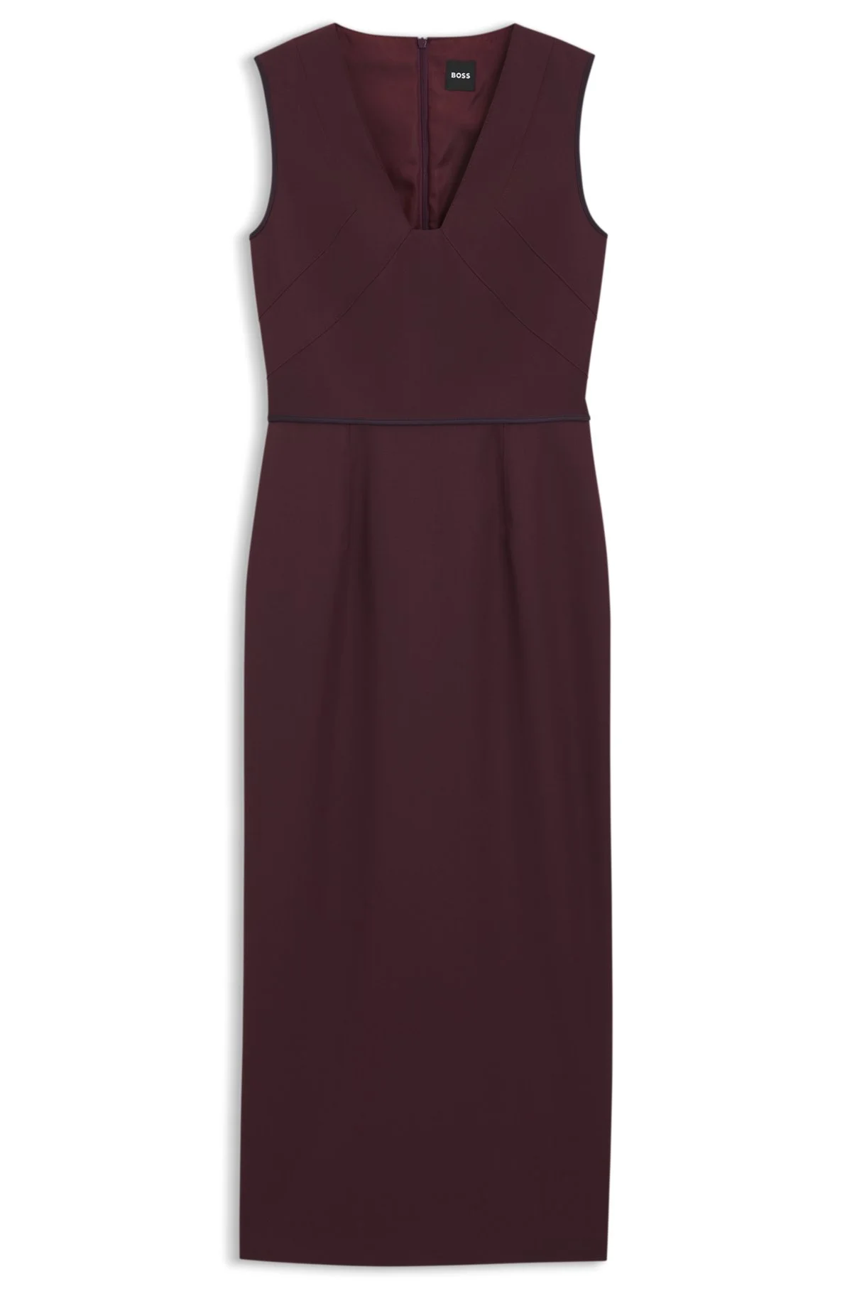 SIZE AND FIT The model wears a size 4 and is 5'9" tall with a, 32" chest, 23" waist and 35" hips. DETAILS Create chic business looks with the long length and waistband piping of this BOSS Womenswear dress. Soft twill made from virgin wool. Slim fit Neckline: V-neck Fastening top: Zip closure Sleeveless Back slit Partially lined Fit back length: 130 cm (51 inches) Drumialdan - 50555410 QUALITY & CARE INSTRUCTIONS Material: 100% Virgin wool, Lining: 55% Polyester, 45% Viscose, Insert: 72% Acetate, 28% Viscose Do Not Wash Do Not Bleach Iron Low Heat Reduced Dry Clean Do Not Tumble Dry