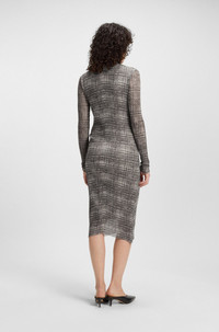 SIZE AND FIT The model wears a size S and is 5'10" tall with a, 31" chest, 24" waist and 34" hips. DETAILS Eviba1 - 50543182 With its mock neckline and slim fit in patterned plisse tulle, this BOSS Womenswear dress strikes a contemporary profile. Breathable modal lining. Slim fit Neckline: Mock Neck Long sleeves QUALITY & CARE INSTRUCTIONS Do Not Bleach Do Not Tumble Dry Iron Low Heat Quality: 94% Polyester, 6% Elastane, Lining: 100% Modal Cold, gentle machine wash; reduced spin speed. Do Not Dry Clean