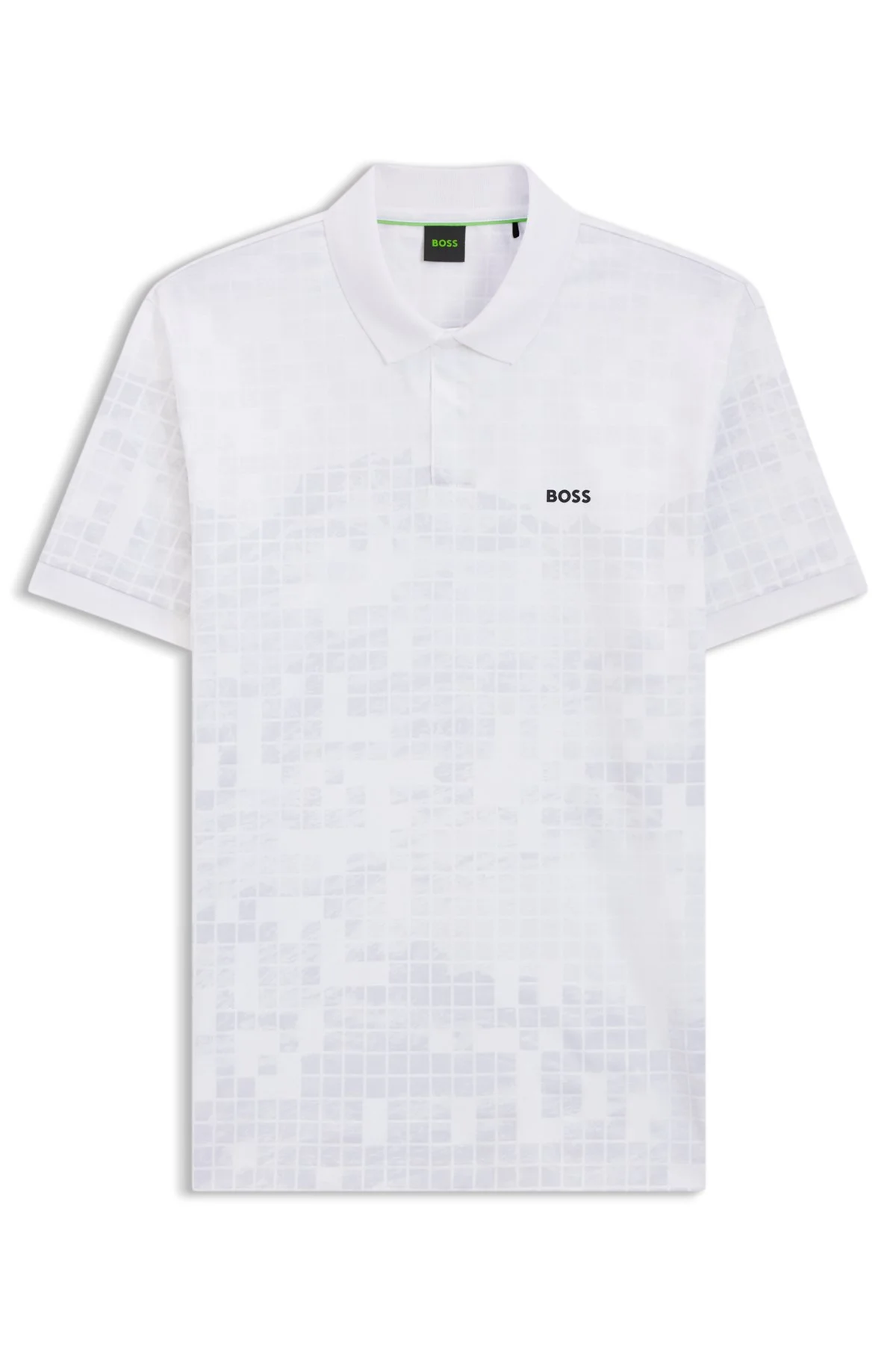 DETAILS In lightweight, mercerized cotton with a dynamic print, this regular BOSS Menswear polo shirt is distinctive and luxurious. Snap-button placket. Logo detail. Regular fit Neckline: Flat-knit collar Number of buttons: 2 Short sleeves Flat-knit cuffs Standard length PL_Clash PLKT - 50548325 QUALITY & CARE INSTRUCTIONS Do Not Bleach Do Not Dry Clean Material: 100% Cotton Do Not Tumble Dry Machine Wash Cold Gentle Iron Low Heat