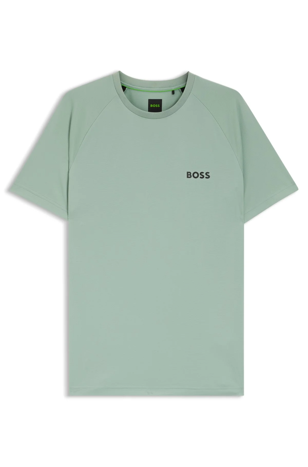 SIZE AND FIT The model wears a size M and is 6'2" tall with a, 41" chest, 33" waist and 40" hips. DETAILS Offering comfortable stretch and moisture management, this BOSS Menswear T-shirt is a must for sports. Slim fit Contrast logo and inserts. Signature-stripe details. Slim fit Neckline: Crew neck Short sleeves Standard length TS_TOC Spin CB - 50554544 QUALITY & CARE INSTRUCTIONS Machine Wash Cold Gentle Do Not Bleach Do Not Tumble Dry Do Not Dry Clean Material: 100% Polyester (97% recycled) Iron Low Heat