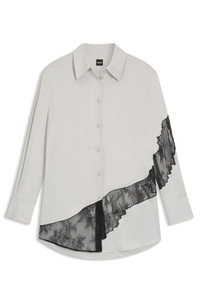 DETAILS Belacey - 50546595 Styled formally or pared back with denim, the satin and lace combination of this BOSS Womenswear blouse makes a modern statement. Easy straight fit. Regular fit Button-down collar Long sleeves Button cuffs QUALITY & CARE INSTRUCTIONS Quality: 100% Viscose, Insert: 100% Polyamid Cold, gentle machine wash; reduced spin speed. Do Not Tumble Dry Reduced Dry Clean Iron Low Heat Do Not Bleach