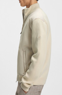 DETAILS C-Ibaio - 50543135 Detailed with a tonal Double B monogram, this BOSS Menswear jacket is a fresh way to layer. Easy regular fit. Mixed materials including soft cotton. Regular fit Stand collar Ribbed cuffs Standard length QUALITY & CARE INSTRUCTIONS Quality: 100% Cotton, Lining: 100% Polyester, Front panel: 100% Polyester, Wadding: 100% Polyester (80% recycled) Cold, gentle machine wash; reduced spin speed. Do Not Tumble Dry Do Not Bleach Iron Medium Heat Do Not Dry Clean