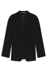 SIZE AND FIT The model wears a size 2 and is 5'9" tall with a, 32" chest, 23" waist and 35" hips. DETAILS Jocaluah - 50490053 A crease-resistant tailored jacket in a straight fit by BOSS Womenswear. This versatile design is crafted in Japanese crepe for comfort. Regular fit Notched lapels Fastening top: Button closure Number of buttons: 1 Pockets top: Flap pockets No cuffs Back vent Partially lined Fit back length: 70 cm (28 inches) QUALITY & CARE INSTRUCTIONS Quality: 69% Triacetate, 31% Polyester, Lining: 54% Viscose, 43% Polyamid, 3% Elastane, Sleeve lining: 64% Viscose, 36% Polyester Do Not Tumble Dry Do Not Bleach Do Not Wash Iron Low Heat Reduced Dry Clean
