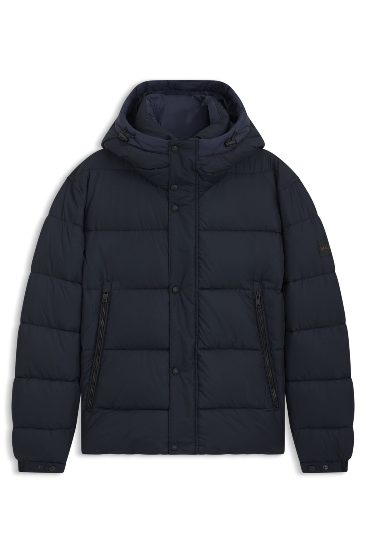 SIZE AND FIT The model wears a size 40R and is 6'0" tall with a, 31" chest, 26" waist and 35" hips. DETAILS Omaris - 50528573 A water-repellent jacket in a regular fit by BOSS. Featuring a hood and zipped side pockets, this piece has signature trims including branded studs. Regular fit Fastening top: Zip and button closure Number of buttons: 4 or more buttons Pockets top: Zip pockets Functional button Standard length Fit back length: 69 cm (27 inches) QUALITY & CARE INSTRUCTIONS Do Not Tumble Dry Quality: 100% Polyester (60% recycled), Filling: 100% Polyester, lining yoke: 100% Polyester, Body Lining: 100% Polyamid very mild professional wet clean Iron Low Heat Do Not Wash Do Not Bleach Do Not Dry Clean