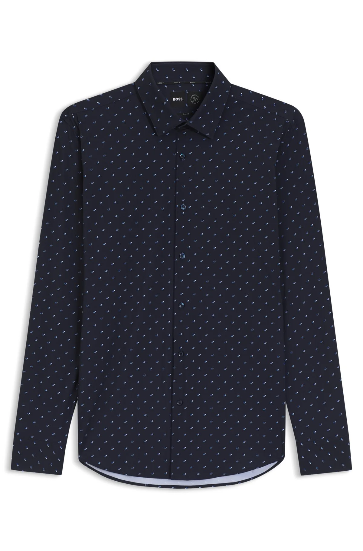 SIZE AND FIT The model wears a size EU:40 and is 6'1" tall with a, 37" chest, 29" waist and 35" hips. DETAILS Cut to a clean fit with a modern print, this BOSS Menswear shirt offers advanced comfort thanks to generous stretch. Kent collar Slim fit Kentkragen Round cuffs P-HANK-s-kent-C1-222 - 50550038 QUALITY & CARE INSTRUCTIONS Dry Clean Only Do Not Tumble Dry Iron Low Heat Machine Wash Cold Gentle Quality: 76% Polyamid, 24% Elastane Do Not Bleach