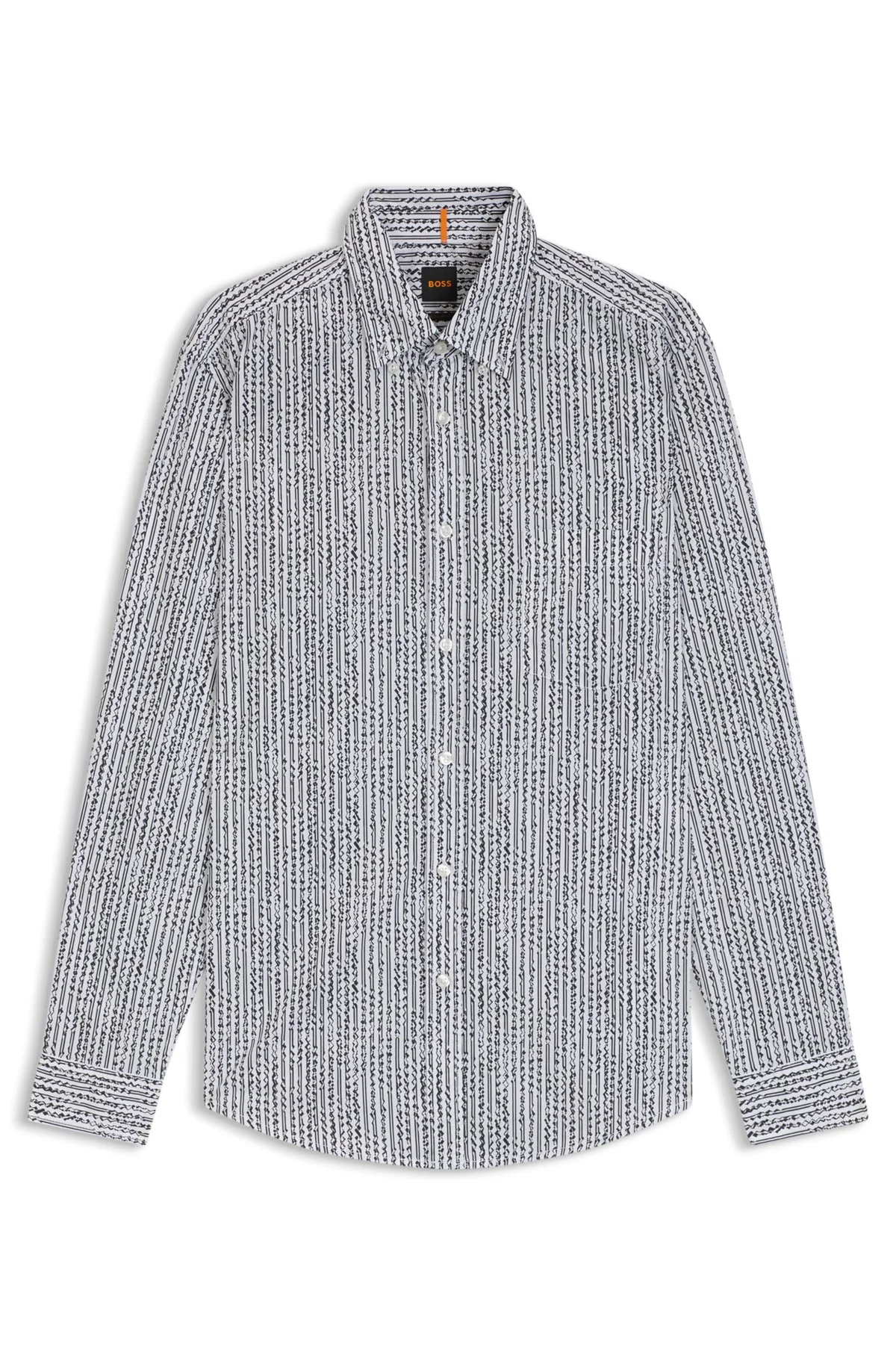 SIZE AND FIT The model wears a size L and is 6'2" tall with a, 37" chest, 29" waist and 37" hips. DETAILS Rickert_M - 50543513 Give everyday looks a fresh twist with the contemporary pattern of this BOSS Menswear shirt. Straight fit in breathable cotton poplin with natural stretch. Regular fit Button-down collar Patch chest pockets Round cuffs Standard length QUALITY & CARE INSTRUCTIONS Quality: 100% Cotton Do Not Dry Clean Do Not Tumble Dry Machine Wash Cold Do Not Bleach Iron Low Heat