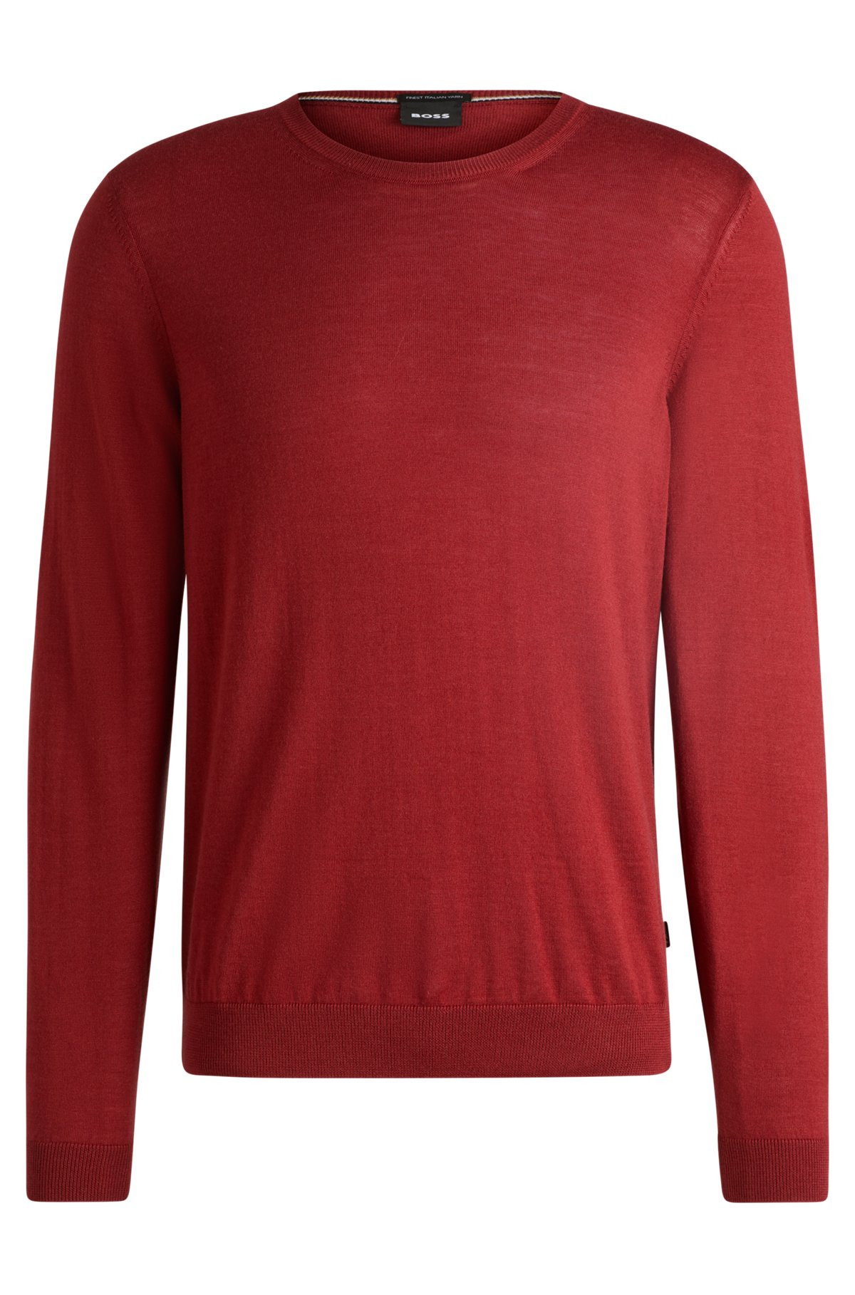 SIZE AND FIT The model wears a size L and is 6'2" tall with a, 37" chest, 29" waist and 37" hips. DETAILS Leno-P - 50468239 A soft and breathable sweater by BOSS Menswear. Cut to a slim fit, this crew-neck layer is crafted in merino wool. Neckline: Crew neck Long sleeves Standard length QUALITY & CARE INSTRUCTIONS Cold, gentle machine wash; reduced spin speed. Iron Medium Heat Dry Clean Only Do Not Tumble Dry Do Not Bleach Quality: 100% Virgin wool