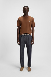 SIZE AND FIT The model wears a size M and is 6'1" tall with a, 33" chest, 24" waist and 36" hips. DETAILS C-Taut 01 - 50520298 Featuring a metallic Double B monogram at the left chest, this BOSS Menswear T-shirt is crafted in mercerized cotton for a super-soft feel. Regular fit Neckline: Crew neck Short sleeves Standard length QUALITY & CARE INSTRUCTIONS Iron Low Heat Do Not Bleach Quality: 100% Cotton Do Not Tumble Dry Machine Wash Cold Gentle Do Not Dry Clean