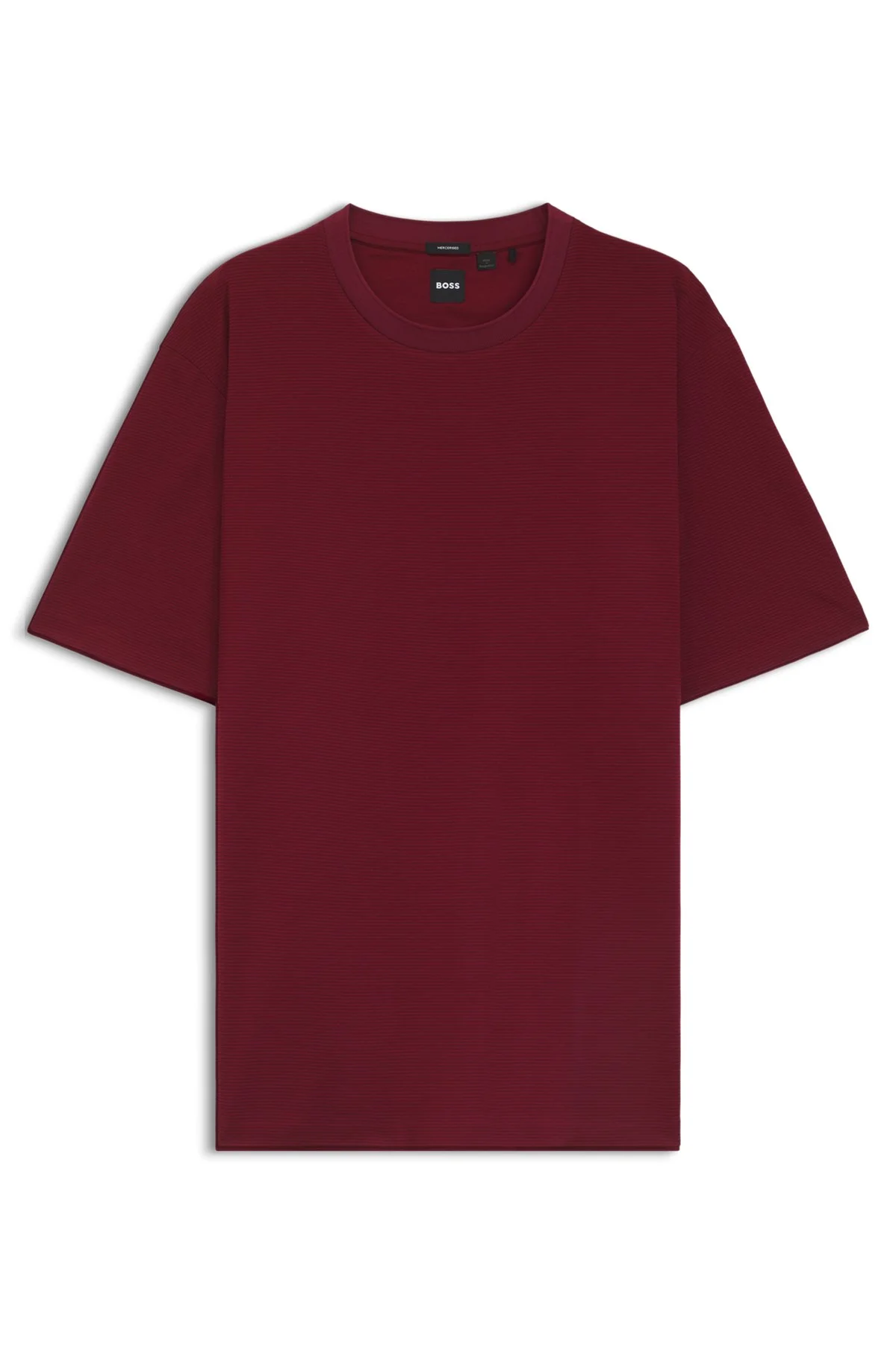 DETAILS Featuring a three-tone micro pattern, this BOSS Menswear T-shirt is crafted in mercerized cotton for a super-soft feel. Casual straight fit. Regular fit Neckline: Crew neck Standard length BT-Thompson 432 - 50561206 QUALITY & CARE INSTRUCTIONS Material: 100% Cotton Machine Wash Cold Gentle Do Not Tumble Dry Reduced Dry Clean Iron Low Heat Do Not Bleach