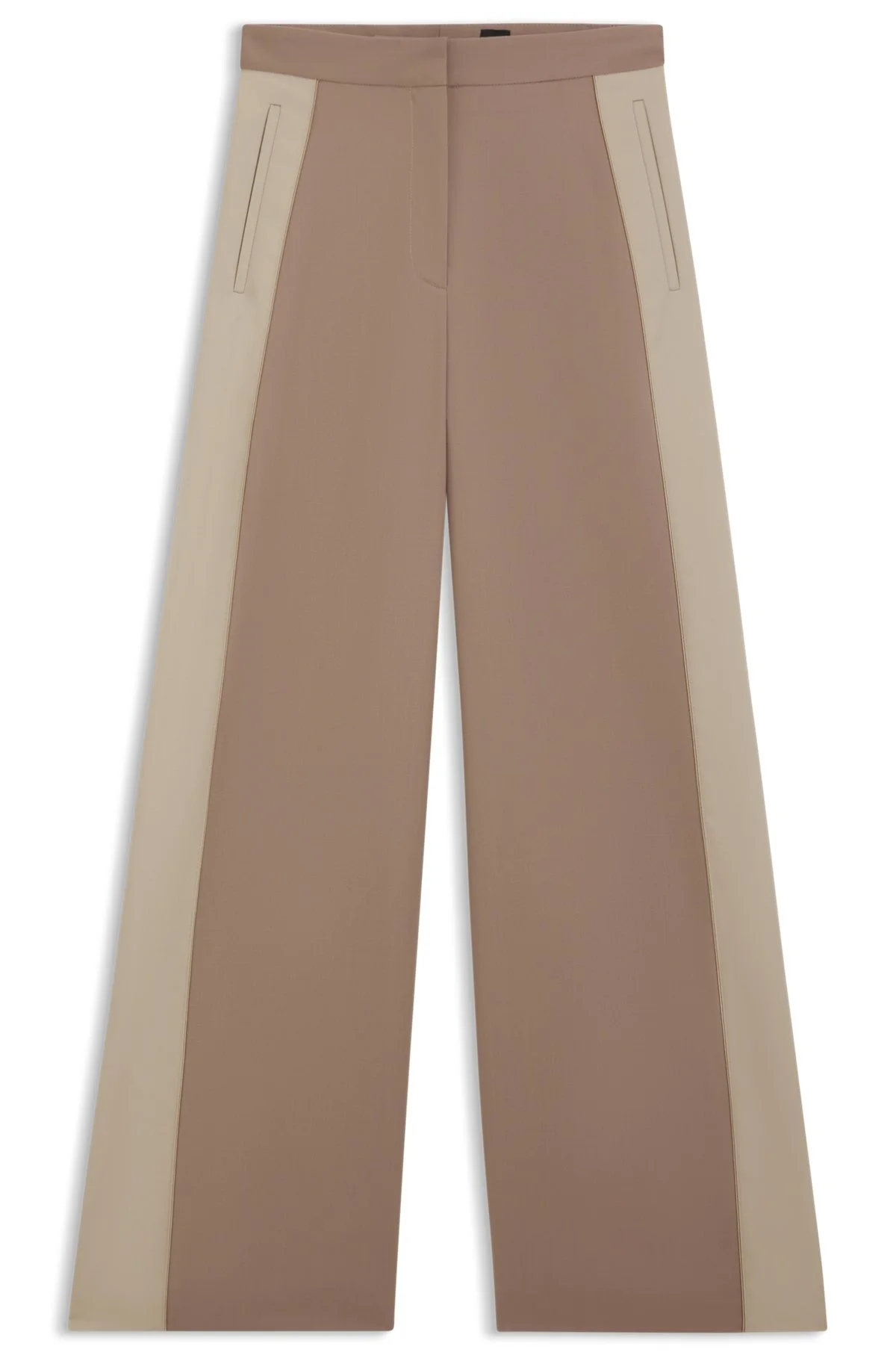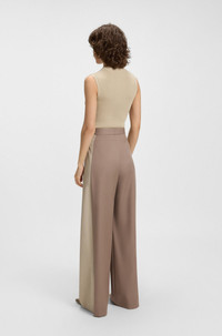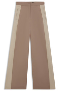 SIZE AND FIT The model wears a size 4 and is 5'9" tall with a, 31" chest, 24" waist and 35" hips. DETAILS Tianal - 50543410 Crafted in virgin-wool twill, these BOSS Womenswear trousers feature statement color-blocking at the side seams. Straight fit with wide leg. Extra long length Regular fit High rise Hook and zip closure Wide leg Crease Pockets bottom front: Ticket pocket Fit foot width: 67,5 cm (26.6 inches) QUALITY & CARE INSTRUCTIONS Do Not Tumble Dry Quality: 100% Virgin wool, pocketing: 55% Polyester, 45% Viscose, side part: 100% Virgin wool Reduced Dry Clean Iron Low Heat Do Not Wash Do Not Bleach