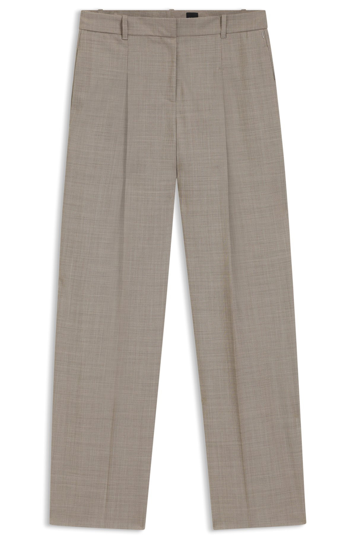 DETAILS Tiana4 - 50554534 Crafted in stretch virgin wool with a classic sharkskin weave, these BOSS Womenswear trousers are an updated formal essential. Straight fit with a wide leg. Regular fit Regular rise Hook and zip closure Wide leg Crease Pockets bottom front: Side pockets Pockets bottom back: Welt pocket Fit foot width: 62,0 cm (24.4 inches) QUALITY & CARE INSTRUCTIONS Reduced Dry Clean Do Not Bleach Do Not Tumble Dry Quality: 99% Virgin wool, 1% Elastane, pocketing: 55% Polyester, 45% Viscose Do Not Wash Iron Low Heat