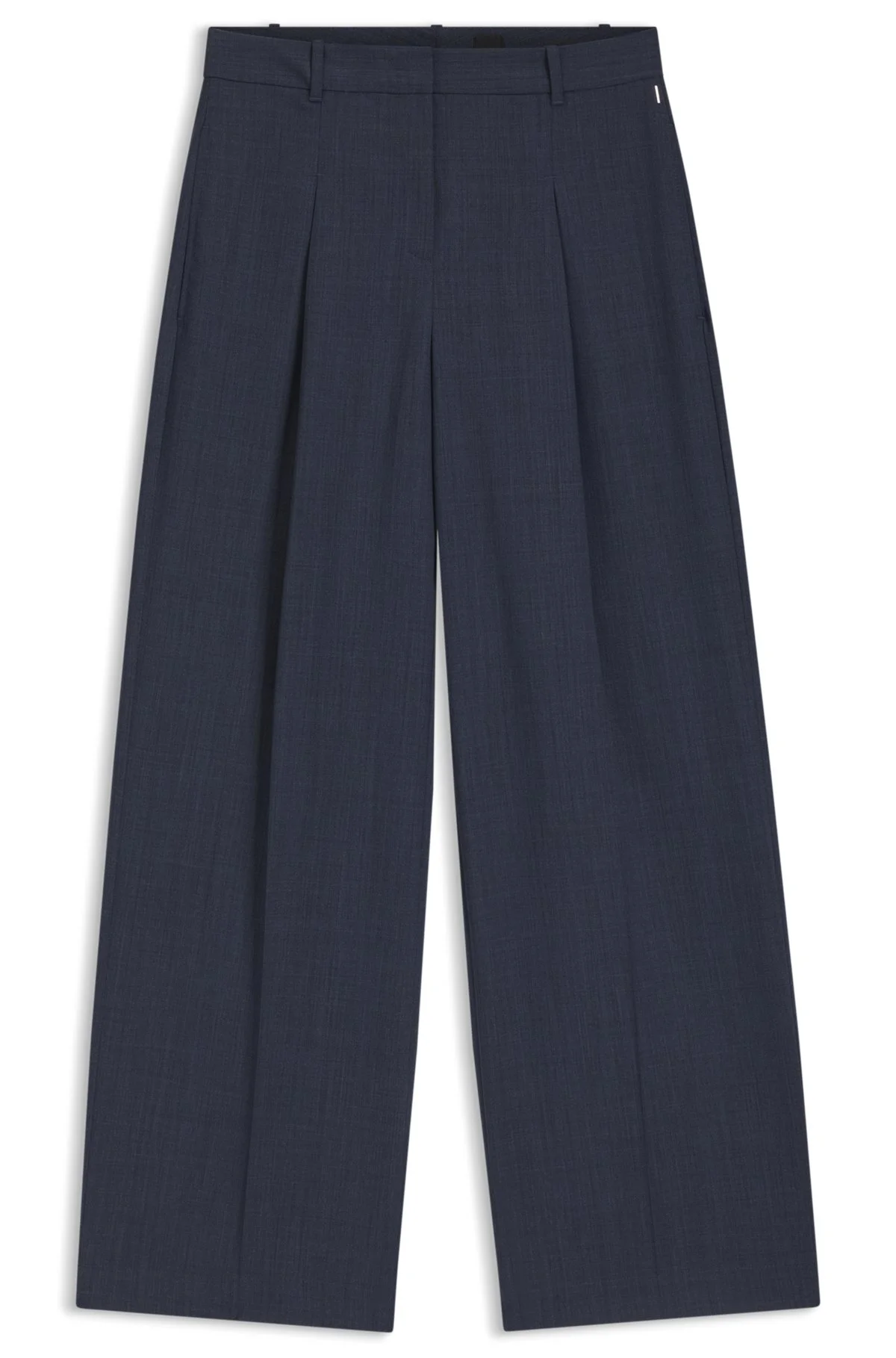DETAILS With pleats and a wide, straight fit, these BOSS Womenswear trousers create a modern formal profile. Crafted in melange wool with natural stretch. Regular fit Regular rise Hook and zip closure Wide leg Pleat front Pockets bottom front: Side pockets Pockets bottom back: Welt pocket Fit foot width: 62,0 cm (24.4 inches) Tiana4 - 50554965 QUALITY & CARE INSTRUCTIONS Do Not Bleach Do Not Wash Do Not Tumble Dry Material: 100% Virgin wool, pocketing: 55% Polyester, 45% Viscose Iron Low Heat Reduced Dry Clean