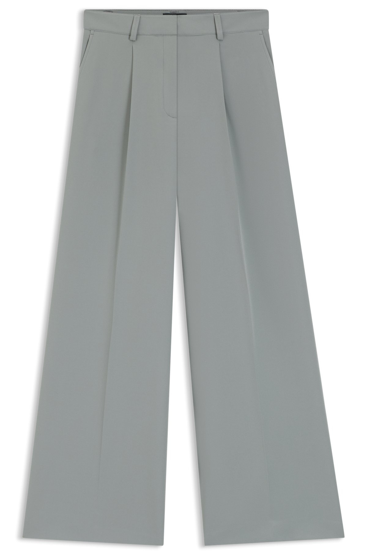 DETAILS C_Tiwi2 - 50545580 An essential formal foundation, these BOSS Womenswear trousers have a modern wide leg emphasized by a front crease. Stretch fabric for comfort. Matching blazer available. wide leg fit Regular rise Hook and zip closure Counter button Wide leg Crease Pockets bottom front: French pocket QUALITY & CARE INSTRUCTIONS Dry Clean Only Machine Wash Cold Gentle Do Not Tumble Dry Quality: 87% Polyester, 13% Elastane, pocketing: 100% Polyester Do Not Bleach Iron Low Heat