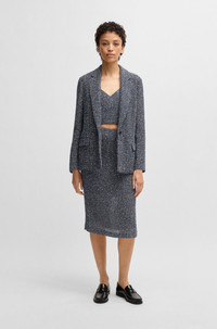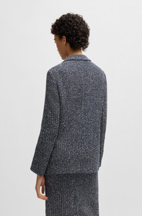 SIZE AND FIT The model wears a size 4 and is 5'10" tall with a, 31" chest, 24" waist and 35" hips. DETAILS Janka5 - 50537484 This characterful BOSS Womenswear blazer comes in a laid-back fit for a modern silhouette. Crocheted with a two-tone tweed effect, blended with cotton. Relaxed fit Reverse lapels Fastening top: Button closure Number of buttons: 2 Pockets top: Flap pockets No cuffs Back vent Fully lined Fit back length: 70 cm (28 inches) QUALITY & CARE INSTRUCTIONS Do Not Wash Do Not Bleach Quality: 50% Cotton, 38% Polyester, 7% Polyurethane, 5% Other fibres, pocketing: 100% Cotton Reduced Dry Clean Iron Low Heat Do Not Tumble Dry