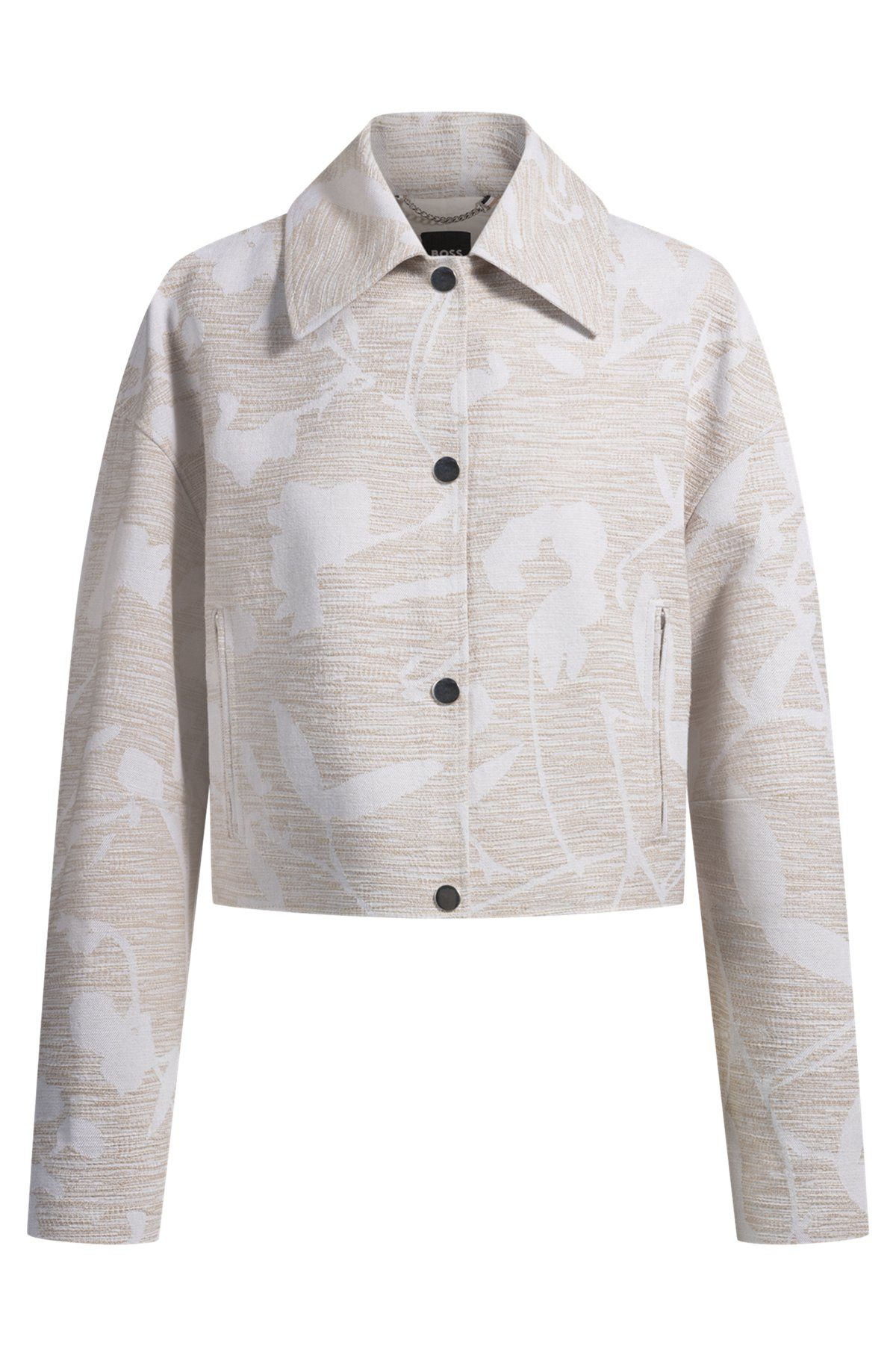 SIZE AND FIT The model wears a size 4 and is 5'9" tall with a, 31" chest, 23" waist and 35" hips. DETAILS Jarlota - 50530887 BOSS Womenswear's blazer is blended with cotton and linen to give the floral weave extra character. Relaxed fit, cropped length, snap closures. Relaxed fit Fastening top: Button closure Number of buttons: 4 or more buttons Pockets top: Zip pockets Adjustable cuffs Fully lined Fit back length: 48 cm (19 inches) QUALITY & CARE INSTRUCTIONS Reduced Dry Clean Do Not Bleach Do Not Tumble Dry Do Not Wash Iron Low Heat Quality: 42% Cotton, 34% Polyester, 17% Viscose, 7% Linen, Lining: 55% Polyester, 45% Viscose, Waistband: 90% Polyacrylic, 8% Polyamid, 2% Elastane