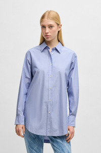SIZE AND FIT The model wears a size 4 and is 5'10" tall with a, 31" chest, 24" waist and 35" hips. DETAILS C_Bostucci_6 - 50531052 Patterned with a vertical stripe, BOSS Womenswear's blouse is blended with sparkling yarns for a modern look. Relaxed fit, cotton-rich poplin, curved hem. Relaxed fit Point collar Long sleeves Button cuffs Patch chest pockets Fit back length: 84 cm (33 inches) QUALITY & CARE INSTRUCTIONS Quality: 95% Cotton, 3% Metallizing, 2% Polyester Do Not Bleach Do Not Tumble Dry Do Not Iron Do Not Dry Clean Machine Wash Cold Gentle
