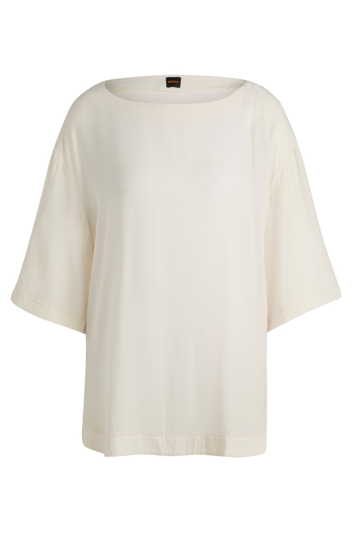 SIZE AND FIT The model wears a size 4 and is 5'10" tall with a, 33" chest, 24" waist and 35" hips. DETAILS C_Ikatta - 50524216 An effortless scoop-neck blouse in a relaxed fit by BOSS. Crafted in lightweight canvas, this piece features short sleeves and contrast stitching. Relaxed fit Club collar Short sleeves Fit back length: 53 cm (21 inches) QUALITY & CARE INSTRUCTIONS Machine Wash Cold Quality: 50% Viscose, 50% Cupro Iron Medium Heat Do Not Bleach Do Not Tumble Dry Do Not Dry Clean