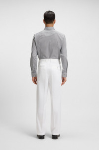 SIZE AND FIT The model wears a size 32/32 and is 6'1" tall with a, 36" chest, 29" waist and 36" hips. DETAILS C-Kai-DPL - 50546924 With their relaxed fit and front pleats, these BOSS Menswear trousers are so easy to style. Crafted in rigid twill made from cotton. Relaxed fit Regular rise Button and zip closure Pleat front Pockets bottom front: French pocket Pockets bottom back: Welt pocket with buttons QUALITY & CARE INSTRUCTIONS Do Not Tumble Dry Machine Wash Cold Gentle Reduced Dry Clean Iron Low Heat Quality: 100% Cotton Do Not Bleach