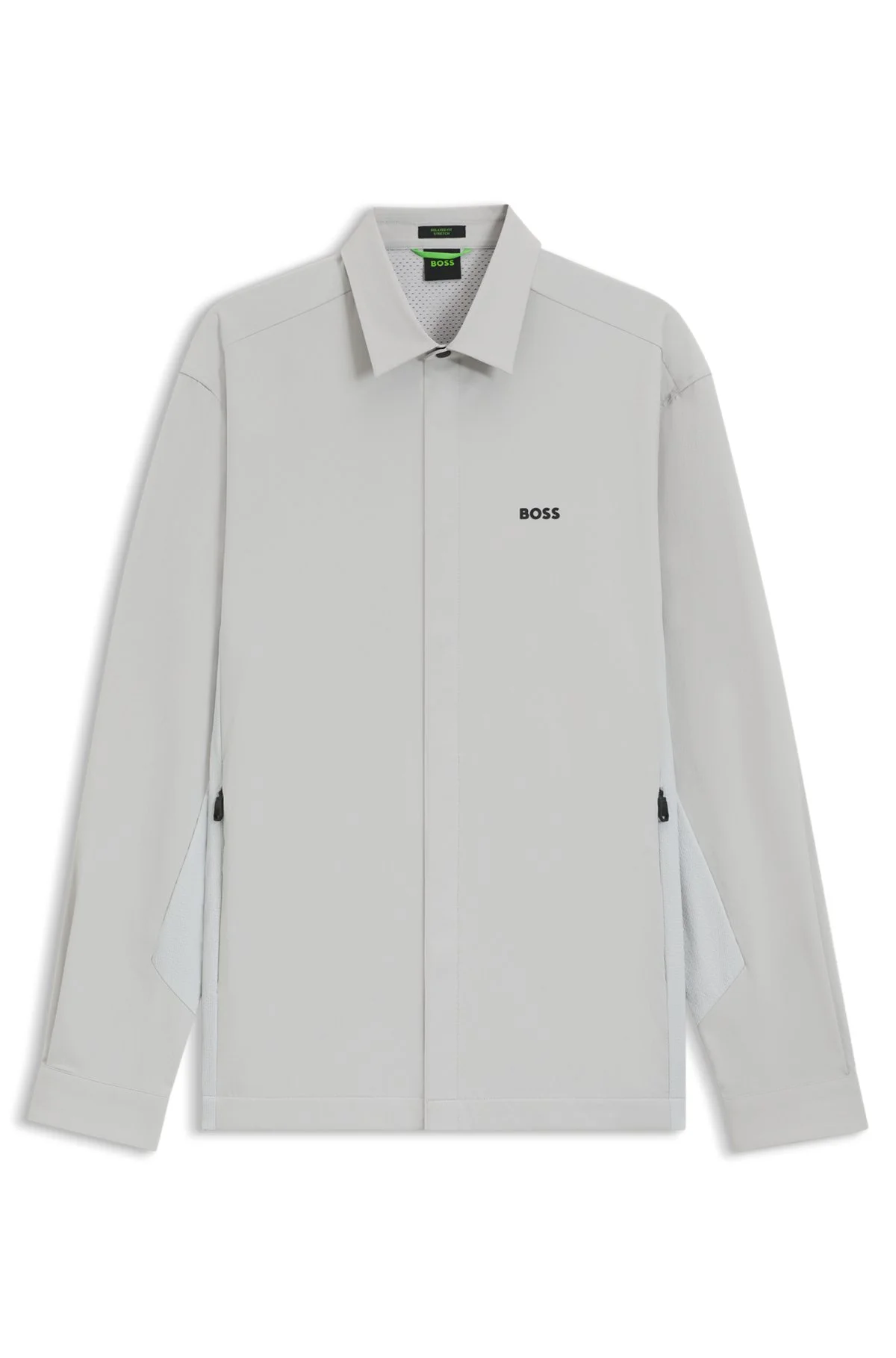 SIZE AND FIT The model wears a size M and is 6'0" tall with a, 36" chest, 31" waist and 35" hips. DETAILS With decorative reflective details, this relaxed BOSS Menswear overshirt is made in stretchy water-repellent fabric. Flexible underarm inserts. Open yoke with ventilating mesh lining. Relaxed fit Kent collar Barrel cuffs B_Urban TechDobby L - 50544828 QUALITY & CARE INSTRUCTIONS Iron Low Heat Do Not Tumble Dry Material: 88% Polyamid, 12% Elastane Do Not Bleach Do Not Dry Clean Machine Wash Cold Gentle