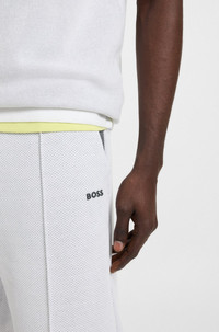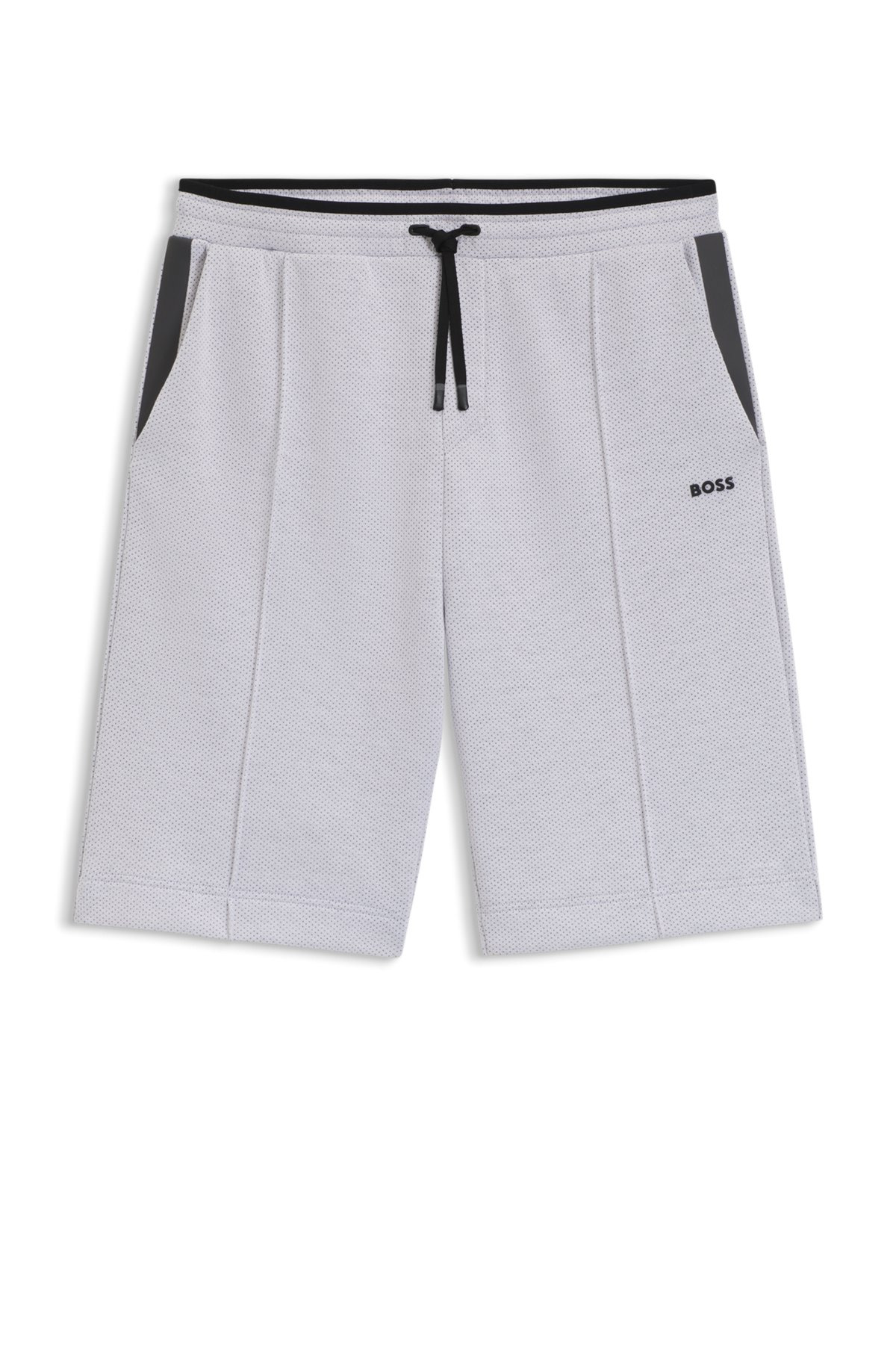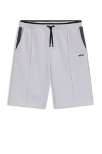 SIZE AND FIT The model wears a size M and is 6'0" tall with a, 36" chest, 31" waist and 35" hips. DETAILS Shorts TL - 50543146 With sporty printed stripes and binding details, these relaxed-fit BOSS Menswear shorts are a dynamic option. V-shape cutlines. Quilted jacquard with cotton. Logo detail. Relaxed fit Regular rise Drawstring Pockets bottom front: Side pockets Pockets bottom back: Welt pocket QUALITY & CARE INSTRUCTIONS Do Not Bleach Quality: 62% Polyester, 38% Cotton Iron Low Heat Do Not Tumble Dry Do Not Dry Clean Machine Wash Cold Gentle