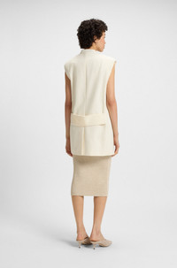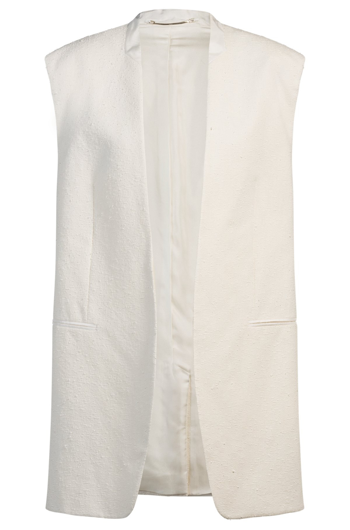 DETAILS Jasia - 50545972 Crafted in Italian-made boucle for elevated style, this BOSS Womenswear blazer can be dressed up or down. Sleeveless, edge-to-edge styling. Silk collar. Relaxed fit Pockets top: Jetted pockets Back vent Fully lined Fit back length: 84 cm (33 inches) QUALITY & CARE INSTRUCTIONS Dry Clean Only Do Not Tumble Dry Do Not Bleach Iron Low Heat Do Not Wash Quality: 95% Cotton, 5% Polyamid, Lining: 55% Polyester, 45% Viscose, Collar: 100% Silk