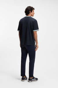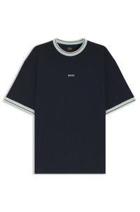 SIZE AND FIT Relaxed fit The model wears a size M and is 6'1" tall with a, 35" chest, 30" waist and 38" hips. DETAILS Featuring a logo print and sporty striped trims, this BOSS Menswear T-shirt is crafted in soft, breathable cotton jersey. Laid-back fit. Crew neckline. Relaxed fit Neckline: Crew neck Short sleeves Standard length Te_Blocks - 50561814 QUALITY & CARE INSTRUCTIONS Do Not Tumble Dry Reduced Dry Clean Iron Low Heat Material: 100% Cotton Machine Wash Cold Gentle Do Not Bleach