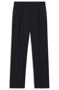 SIZE AND FIT The model wears a size 32R and is 6'2" tall with a, 35" chest, 27" waist and 37" hips. DETAILS C-Peter-PL-CS-253 - 50545809 In a relaxed fit with a front pleat, these BOSS Menswear trousers are ideal for late-summer formals. Wool poplin with a melange effect. Relaxed fit Regular rise Hook and zip closure Pleat front Pockets bottom front: Side slash pockets Pockets bottom back: Welt pocket QUALITY & CARE INSTRUCTIONS Iron Low Heat Quality: 100% Virgin wool, pocketing: 65% Polyester, 35% Cotton Reduced Dry Clean Do Not Tumble Dry Do Not Bleach Do Not Wash