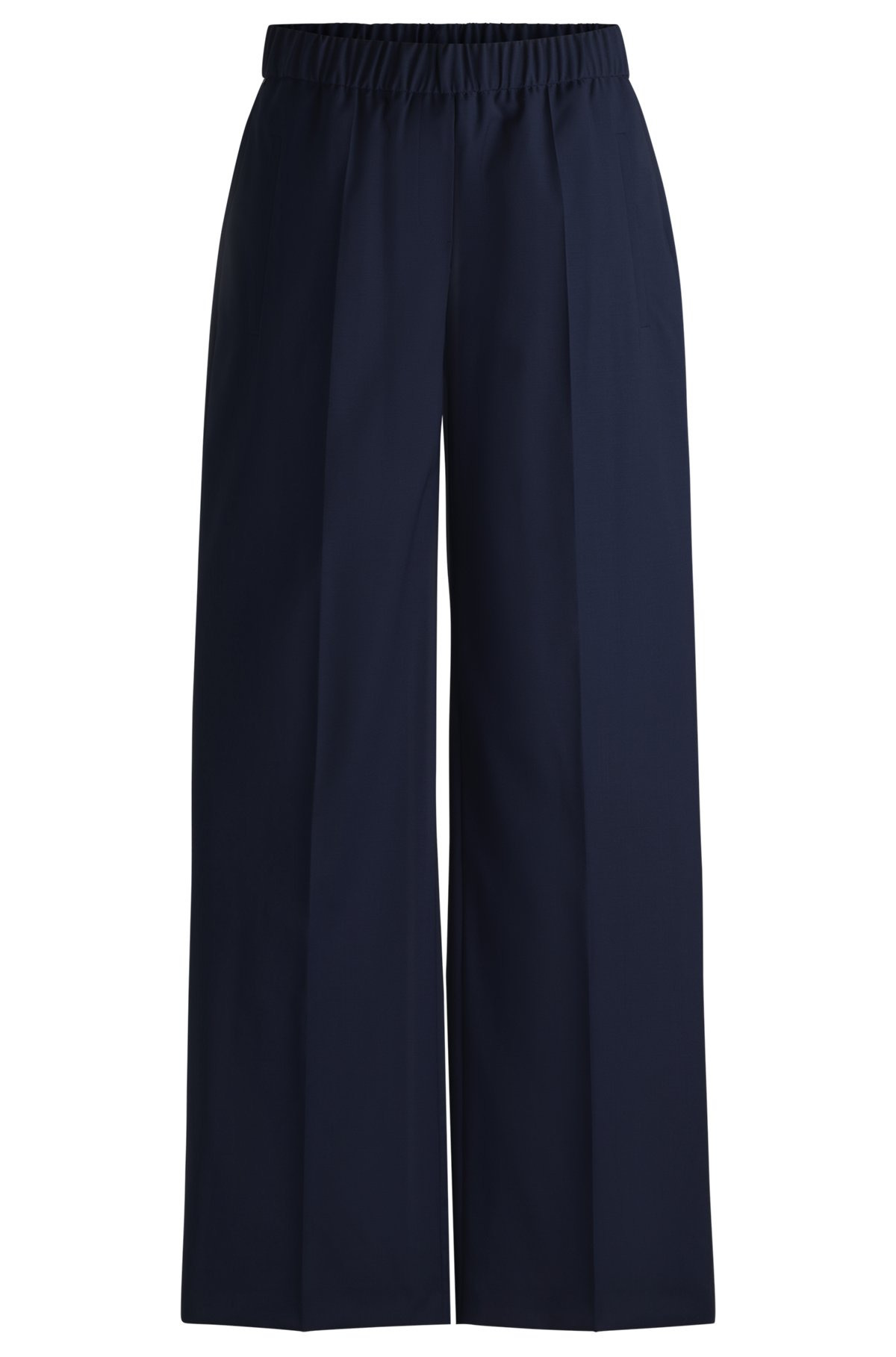 SIZE AND FIT The model wears a size 4 and is 5'9" tall with a, 31" chest, 24" waist and 35" hips. DETAILS Toyal - 50534567 These easy-wear trousers by BOSS Womenswear are cut to a relaxed fit in wool. Elasticated waistband for all-day comfort. Wide leg. Relaxed fit High rise Wide leg Fit foot width: 56,0 cm (22.0 inches) QUALITY & CARE INSTRUCTIONS Quality: 100% Virgin wool, pocketing: 100% Cotton Do Not Tumble Dry Do Not Bleach Do Not Wash Iron Low Heat Reduced Dry Clean