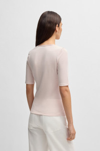 SIZE AND FIT The model wears a size S and is 5'10" tall with a, 0" chest, 24" waist and 35" hips. DETAILS Ejita - 50537596 A versatile foundation, this BOSS Womenswear T-shirt has a ribbed structure for form-fitting effect. Deep scoop neckline and cropped sleeves. Stretch fabric. Slim fit Neckline: Scoop neck 3/4 sleeves Fit back length: 58 cm (23 inches) QUALITY & CARE INSTRUCTIONS Do Not Bleach Iron Low Heat Quality: 100% Lyocell, Facing: 100% Viscose Reduced Dry Clean Do Not Tumble Dry Cold, gentle machine wash; reduced spin speed.
