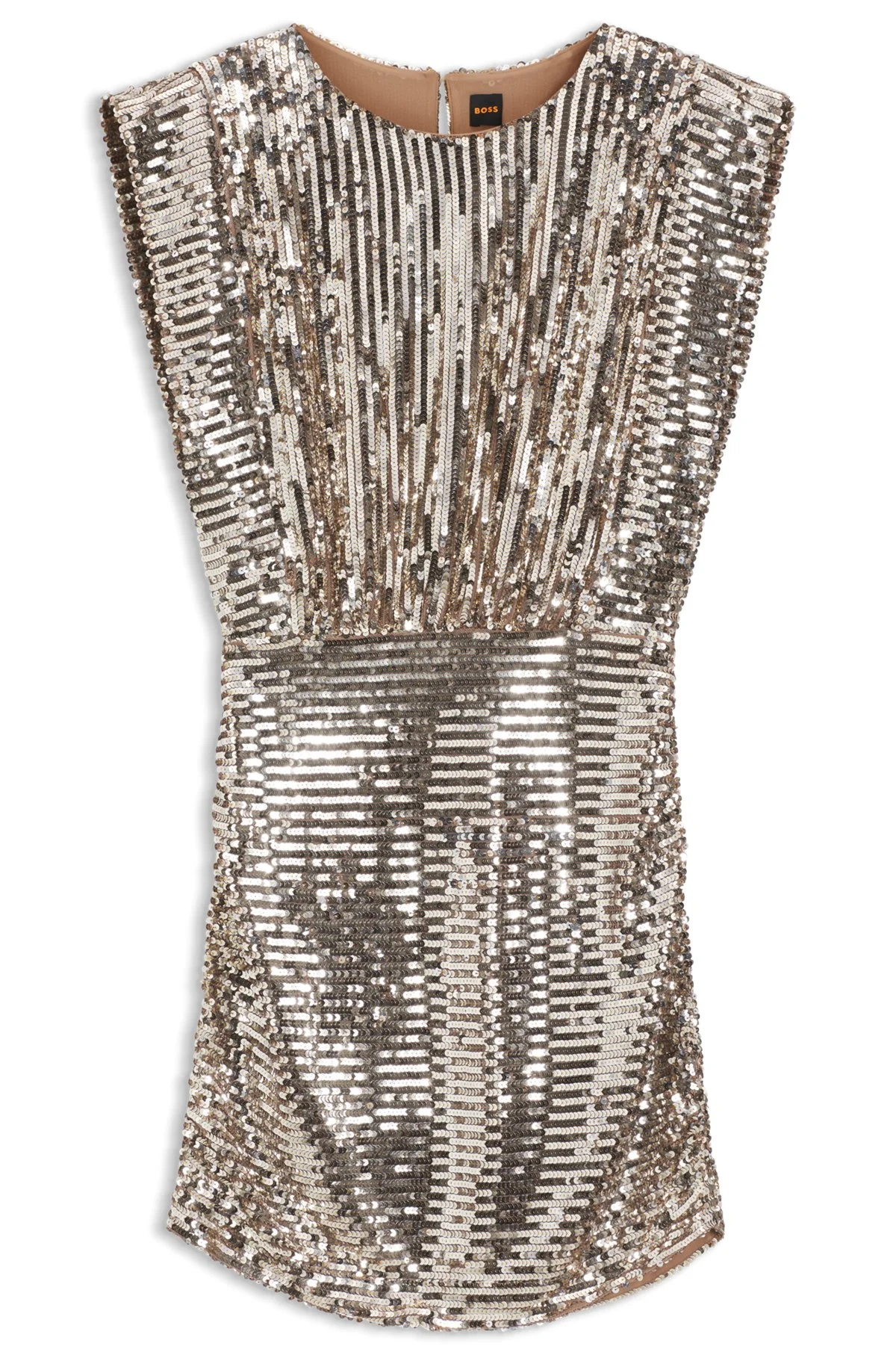 SIZE AND FIT The model wears a size 4 and is 5'10" tall with a, 33" chest, 23" waist and 34" hips. DETAILS Go for effortless evening glamour with this sequinned BOSS Womenswear dress. Its slim fit, with shoulder pads and gathered sides, creates a flattering silhouette. Slim fit Neckline: Crew neck Fastening top: Zip and button closure Sleeveless Fully lined Fit back length: 85 cm (33 inches) C_Dillana - 50548317 QUALITY & CARE INSTRUCTIONS Do Not Bleach Do Not Tumble Dry Material: 95% Polyester, 5% Elastane, Lining: 100% Polyester Dry Clean Only Do Not Wash Do Not Iron