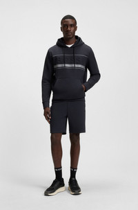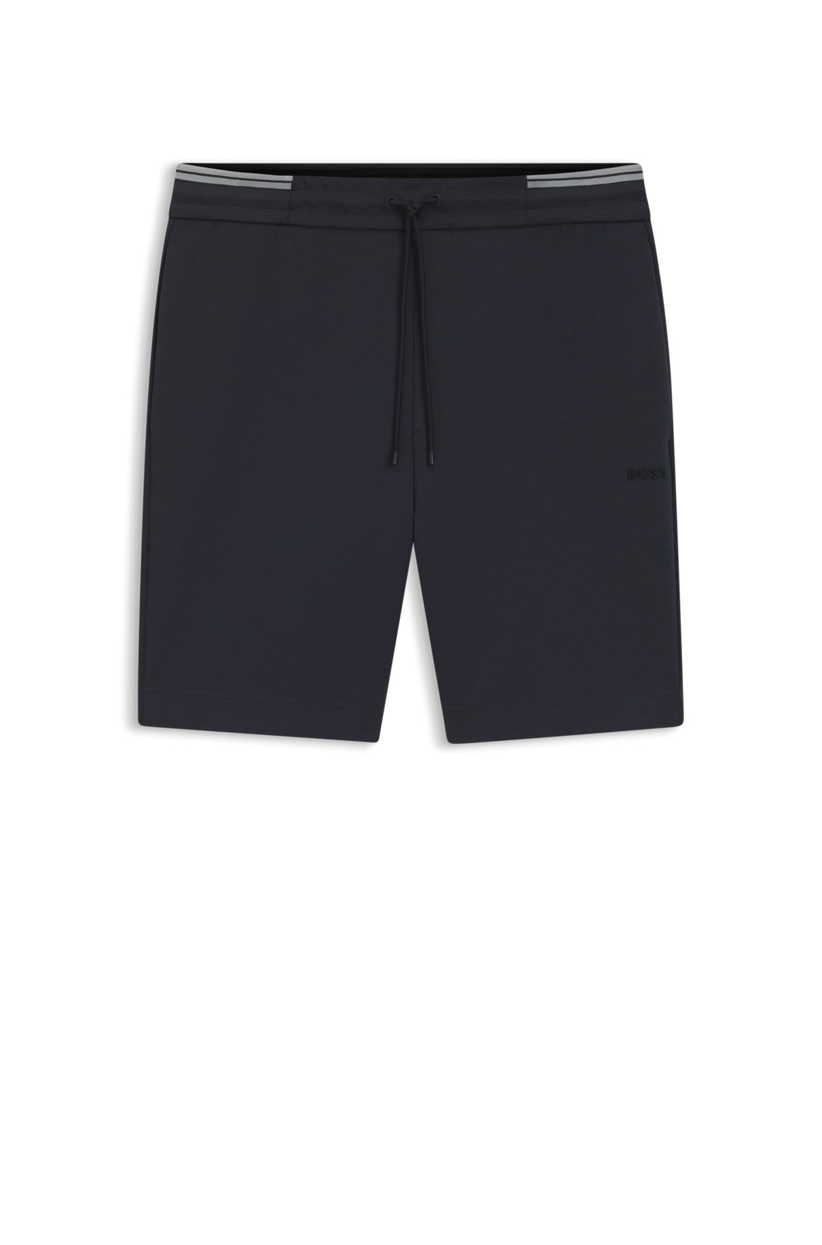 DETAILS Shorts Zone - 50543091 With stripe details on the drawstring waistband, these straight-fit BOSS Menswear shorts make a great casual building block. Stretchy cotton blend. Molded logo. Regular fit Regular rise Drawstring Pockets bottom front: Side pockets Pockets bottom back: Welt pocket QUALITY & CARE INSTRUCTIONS Do Not Tumble Dry Do Not Dry Clean Do Not Bleach Iron Low Heat Quality: 62% Cotton, 33% Polyester, 5% Elastane, pocketing: 100% Polyester Machine Wash Cold Gentle