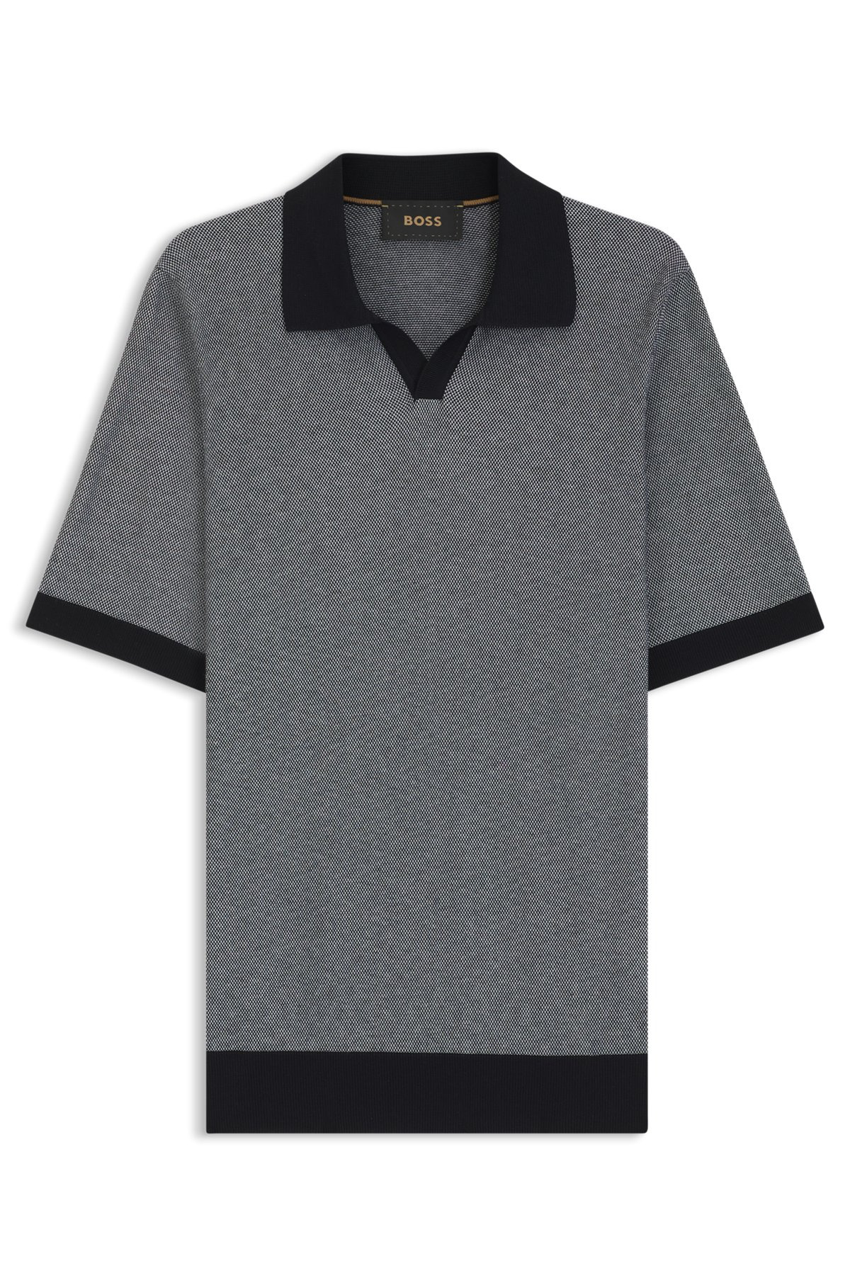 SIZE AND FIT The model wears a size L and is 6'1" tall with a, 36" chest, 29" waist and 37" hips. DETAILS L-Distratto - 50519587 A short-sleeved sweater in a micro-structured silk-cotton blend by BOSS Menswear. This regular-fit piece features an open Johnny collar. Regular fit Neckline: Polo collar Short sleeves Standard length QUALITY & CARE INSTRUCTIONS Do Not Tumble Dry Cold, gentle machine wash; reduced spin speed. Quality: 55% Silk, 45% Cotton, Ribbing: 100% Silk Do Not Bleach Reduced Dry Clean Iron Medium Heat