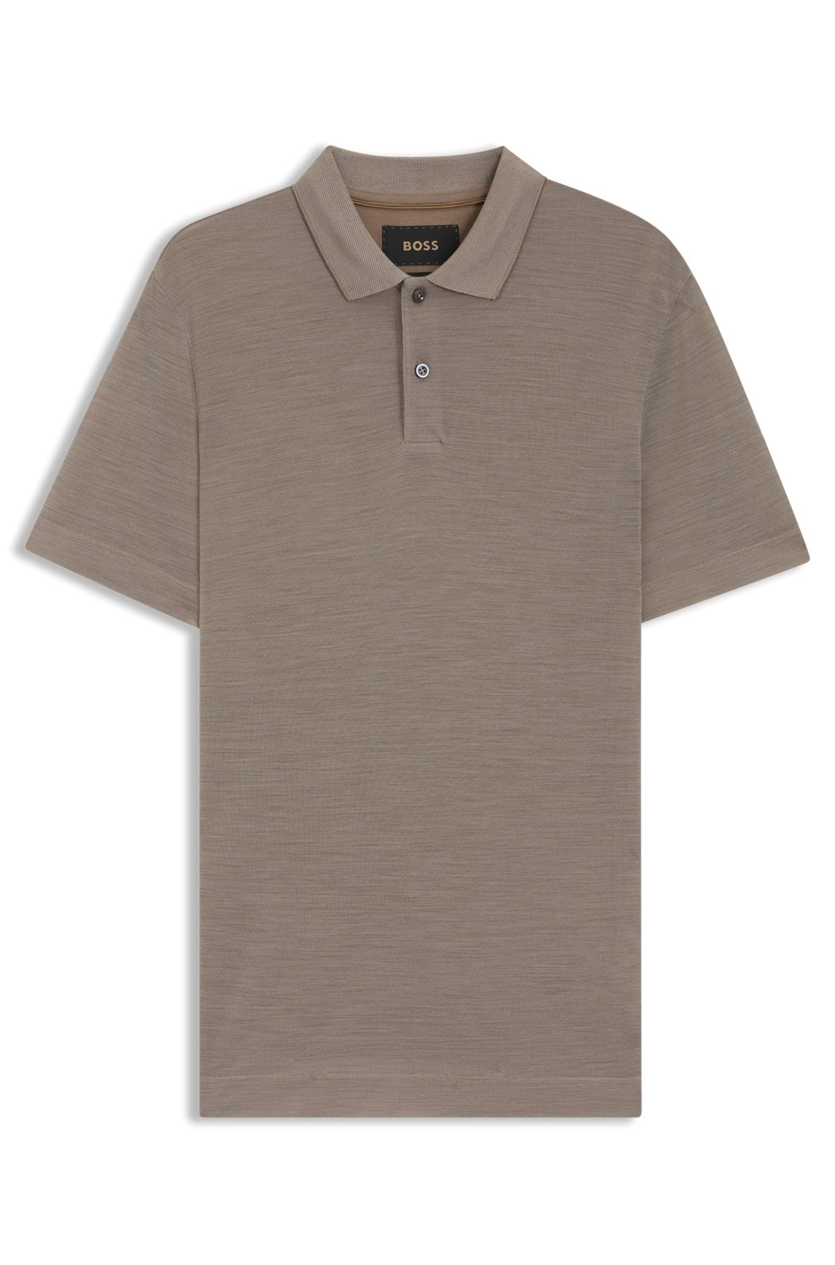 DETAILS L-Perry 113 - 50553161 Breathable and stretchy, this luxurious BOSS Menswear polo shirt is knitted in silk and wool. Regular fit Slightly brushed finish for extra softness. Regular fit Number of buttons: 2 Short sleeves Standard length QUALITY & CARE INSTRUCTIONS Do Not Tumble Dry Iron Low Heat Do Not Wash Do Not Bleach Quality: 50% Wool, 50% Silk Dry Clean Only