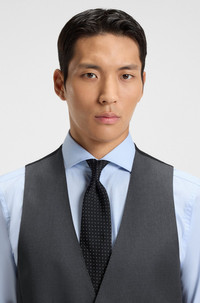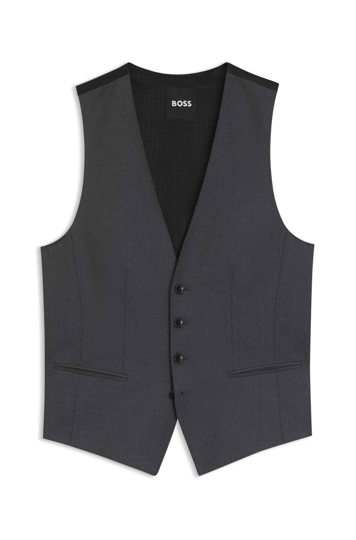 SIZE AND FIT The model wears a size 38R and is 6'1" tall with a, 35" chest, 30" waist and 35" hips. DETAILS H-Huge-Vest-B1 - 50469160 A refined waistcoat by BOSS Menswear. Lined with logo-print material, this single-breasted waistcoat is crafted in virgin-wool serge to match effortlessly with the coordinating trousers and jacket. For our RESPONSIBLE products, we always use at least 60% more sustainable raw materials. This garment is made from at least 60% responsible and certified wool. At HUGO BOSS, responsible wool means it meets the standards of the Five Freedoms of animal welfare. Slim fit Number of buttons: 4 or more buttons Pockets top: Jetted pockets Fully lined QUALITY & CARE INSTRUCTIONS Iron Medium Heat Do Not Tumble Dry Do Not Bleach Do Not Wash Quality: 100% Virgin wool, Lining: 65% Viscose, 35% Polyester, pocketing: 100% Cotton Reduced Dry Clean