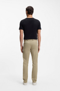 SIZE AND FIT The model wears a size 32/32 and is 6'0" tall with a, 31" chest, 26" waist and 35" hips. DETAILS Chino_slim - 50510933 Easy to style chinos by BOSS Menswear. Cut to a slim fit, this pair is crafted in soft satin with stretch for comfort. Slim fit Regular rise Button and zip closure Slim leg Pockets bottom front: French pocket Pockets bottom back: Welt pocket Unlined QUALITY & CARE INSTRUCTIONS Reduced Dry Clean Do Not Bleach Do Not Tumble Dry Iron Low Heat Quality: 97% Cotton, 3% Elastane Machine Wash Cold Gentle