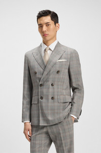 SIZE AND FIT The model wears a size 38R and is 6'1" tall with a, 36" chest, 29" waist and 36" hips. DETAILS L-Heston-DB-252 - 50545382 Refreshing the classic Prince of Wales check, this BOSS Menswear jacket is a formal must. Tailored slim-fit suit in a wool-silk blend Slim fit Partially lined Fit back length: 73 cm (29 inches) QUALITY & CARE INSTRUCTIONS Do Not Wash Reduced Dry Clean Quality: 95% Virgin wool, 5% Silk, Lining: 100% Cupro, Sleeve lining: 100% Cupro Iron Medium Heat Do Not Tumble Dry Do Not Bleach
