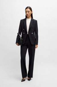 SIZE AND FIT The model wears a size 4 and is 5'9" tall with a, 0" chest, 23" waist and 35" hips. DETAILS Jabilie1 - 50525212 A contemporary jacket by BOSS. Featuring a double-breasted closure, this piece is cut to a streamlined fit in stretch material. Slim fit Reverse lapels Fastening top: Button closure Number of buttons: Double-breasted Pockets top: Flap pockets Slit cuffs No vent Fully lined QUALITY & CARE INSTRUCTIONS Do Not Bleach Do Not Tumble Dry Dry Clean Only Iron Low Heat Machine Wash Cold Gentle Quality: 88% Polyester, 12% Elastane, Lining: 100% Polyester