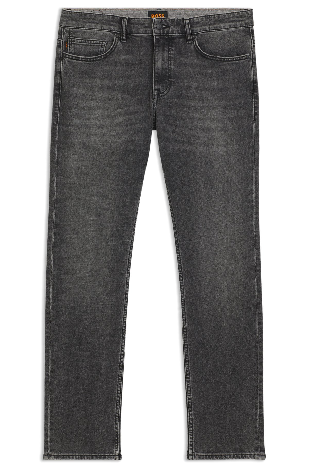 SIZE AND FIT The model wears a size 32/32 and is 6'2" tall with a, 37" chest, 30" waist and 37" hips. DETAILS DELAWARE BO - 50544635 In soft cross-hedge denim blended with stretch, these gray BOSS Menswear jeans make a versatile choice. Cut to a defined fit. Lasered used effects. Slim fit Regular rise Button and zip closure Pockets bottom front: Side pockets Slim leg Pockets bottom back: Patch pocket Standard length Fit foot width: 36,0 cm (14.2 inches) QUALITY & CARE INSTRUCTIONS Iron Medium Heat Do Not Bleach Do Not Dry Clean Machine Wash Cold Gentle Do Not Tumble Dry Quality: 98% Cotton, 2% Elastane