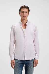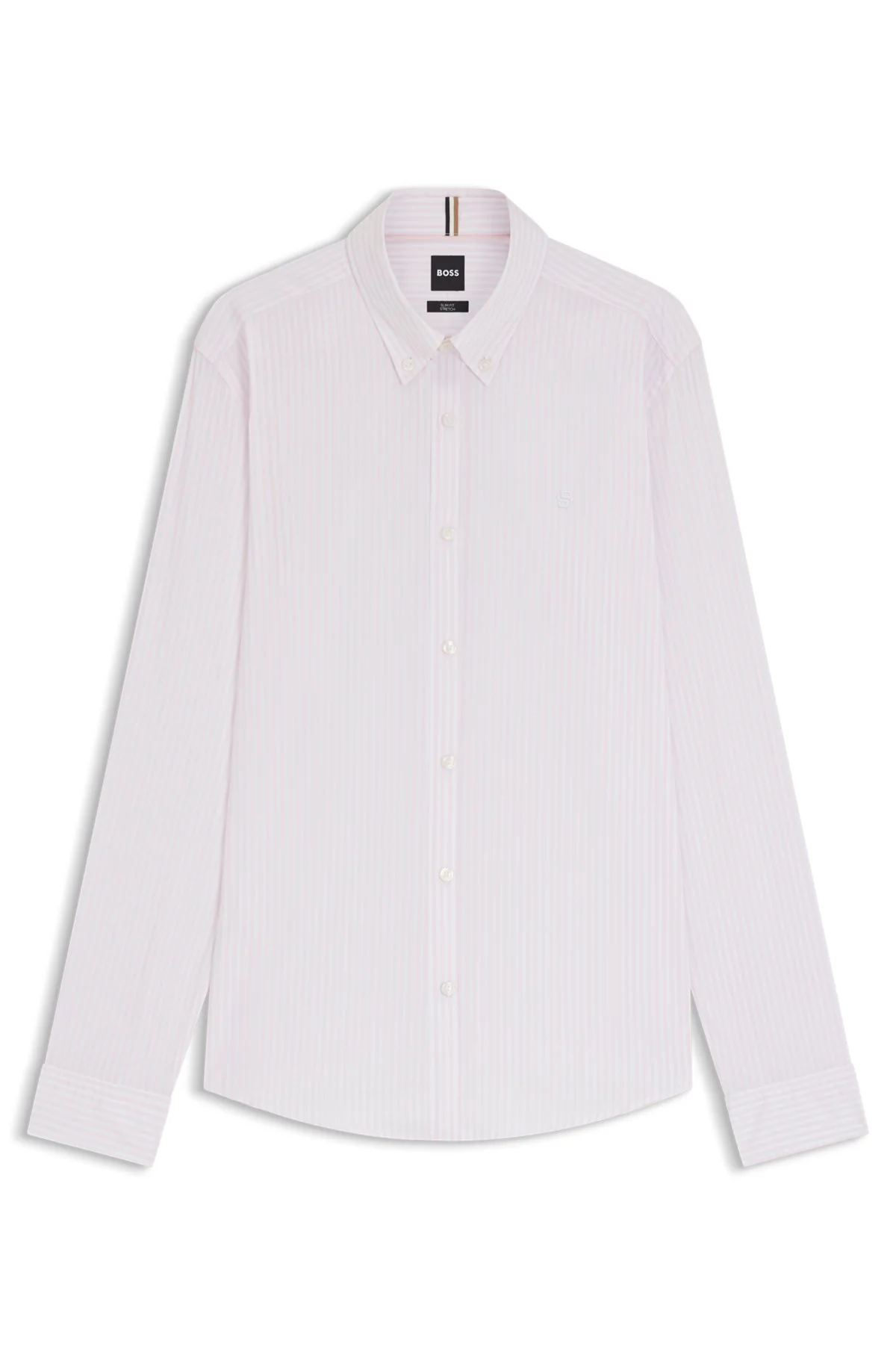 DETAILS H-ROAN-BD-E-C1-253 - 50545235 With a clean stripe punctuated by a Double B monogram, this slim BOSS Menswear shirt strikes a fresh casual note. satin with stretch. Slim fit Button-down collar Round cuffs QUALITY & CARE INSTRUCTIONS Quality: 72% Cotton, 24% Polyamid, 4% Elastane Do Not Tumble Dry Iron Low Heat Machine Wash Warm Gentle Do Not Bleach Dry Clean Only